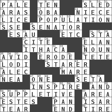 ACROSS 1. Light colored 5. "___ Little Indians" 8. Downhill vehicle 12. Ancient river in northeast Turkey 13. Chief or king in Benin or Nigeria 14. Sibling's daughter 15. Louse (plural) 16. Census information 19. Compass dir. 20. Legislator 21. He sold his birthright 23. And so on (abbr.) 24. R.R. building 27. Quote 30. Flair 31. New York city 34. Part of speech 35. Enthusiastic 38. Eat (away) 40. False hair 41. Farming town in central California 42. A viewer who gazes fixedly 44. Actor Baldwin 45. Female horse 46. Teachers' org. 47. Single 50. Bristle 53. Stimulate to action 57. Plus 59. Supplying deficiencies 63. Type of rug 64. _____ Park, CO 65. Baking dish 66. Austrian river, tributary to the Danube 67. Rend 68. Conclude 69. Hoop that covers a wheel DOWN 1. Friends 2. Ascend 3. Shoestrings 4. Compass dir. 5. Drink excessively 6. Inky black, to poets 7. California wine valley 8. Be seated 9. Luau accessory 10. Environmental prefix 11. Lair 14. Drug cop 17. Shoshoni 18. Car dealer's back yard 20. Set or collection 22. Being or containing an acid 24. _ gin 25. Pulled tight 26. Singer Murray 28. Definite Article 29. Hearing organs 30. Main course 32. Small bed 33. First man 35. Actor Alda or Thicke 36. Grand slam 37. The content of cognition 39. Period 43. Celtic language 47. Petroleums 48. Compass dir. 49. Eastern Standard Time (abbr.) 51. Tarsus (plural) 52. Approach 54. Corncob 55. "Terrible" tsar 56. Tear apart 58. Have the gumption 59. Arrange properly for use 60. Purpose 61. Parent Teacher Association (abbr.) 62. For each 63. Small island