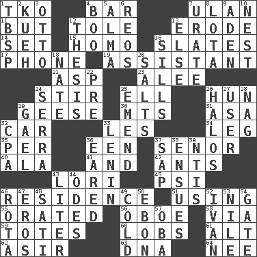 ACROSS 1. Ring climax 4. Tavern 7. ____ Bator 11. Yet 12. Lacquered or enameled metalware 13. Eat (away) 14. Put into a specified state 15. Same (prefix) 16. Chalkboards 17. Give a jingle 19. Aide 21. Viper 23. Toward shelter 24. Agitate 25. Pipe bend 26. Attila the _ 29. Honkers 30. Mountains (abbr.) 31. White ___ sheet 32. 4-wheeled motor vehicle 33. French article 34. Part of a journey 35. For each 36. Car or cant ending 37. Sir (Sp.) 40. Chicken ___ king 41. Also 42. Pismires 43. Australian parrot (variant) 45. Air pressure measure (abbr.) 46. Home 51. Putting into practice 55. Declaimed 56. Mitch Miller's instrument 58. By way of 59. Lugs 60. Tennis shots 61. Keyboard modifier key 62. SW Saudi Arabia district 63. Heredity factor (abbr.) 64. Born DOWN 1. Cook's measure (abbr.) 2. Malaysian steamed pastry 3. "Beetle Bailey" pooch 4. Surprise greeting 5. _ mater 6. Vintage cars 7. A salt of uric acid 8. Globular water bottle used in Asia 9. An important port of Yemen 10. A home for chicks 12. College paper 13. Otherwise 16. Beverly of Met fame 18. Nathan's nickname 20. Table seasonings 22. Before (prefix) 24. Spanish missionary in California 25. Make improvements or corrections to 26. Rings 27. One who uses or employs something 28. Tired old horse 29. Highlander 32. Numbers guy (abbr.) 33. Soviet premier 1918-24 36. Having ears or earlike features 37. Plant excrement 38. Follows as a consequence or result 39. Nuclear Threat Initiatives 43. 61 cubic inches 44. Lyric poems 46. Round or rotation of duties 47. Greek god of love 48. Suttee (variant) 49. Having a low temperature 50. Inky black, to poets 52. _ the terrible 53. The longest river in the world 54. Yard entry 57. Chief or king in Benin or Nigeria