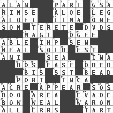 ACROSS 1. ____ Jay Lerner 5. Component 9. Girls' org. (abbr.) 12. Wash lightly 14. Medicinal plant 15. Part of a journey 16. Upward 17. Pale green bean 18. Single 19. Male offspring 20. Cigar-shaped 23. Movie discs 24. Wise men 25. Double curve, resembling the letter S 27. Competent 30. Naughty child 32. Elected rep. 33. Actress Patricia 34. Disposed of to a purchaser 36. Eastern Standard Time (abbr.) 38. Black tropical American cuckoo 39. Ocean 40. _ tizzy (2 wds.) 43. Two (Sp.) 46. Relaxation 48. Wrote a lyric poem 49. Twice 51. Fast jet (abbr.) 52. Necklace unit 53. Sweet dark-red dessert wine 54. South American Indian 56. 1/640 square mile 58. Become visible 61. Mayday 64. Surprise greeting 65. Type of rug 66. Dodge 68. Arrow shooter 69. Welt 70. Make _____ (do battle with) 71. 100% 72. Blunders 73. Small pie DOWN 1. Caspian sea tributary 2. _ and Stitch 3. Soon (poet.) 4. Overdraft (abbr.) 5. Diluted with white 6. Set down 7. Lover boys 8. Beverage made from leaves 9. Michael Jackson trademark 10. Transmit 11. Ripens 13. Singer James 21. Armor plate that protects the chest 22. Full of chinks, cracks, or crevices 23. Cub Scout units 24. Cartoonist voice _ Blanc 26. Unit of force equal to gravity 27. Santa ___, CA 28. Benjamin's nick name 29. Put down 31. Entreaties 35. Hyrax 37. Periodic rise and fall of the sea level 41. Teachers' org. 42. Say or write further 44. Mitch Miller's instrument 45. Title for a knight 47. Inactive volcano in Sicily 48. Chief or king in Benin or Nigeria 50. A viewer who gazes fixedly 53. Move like a hungry wolf 55. Ship's personnel 56. Swedish rock group 57. Calm and collected 59. Lightbulb-shaped fruit 60. Friends 61. "Two Mules for Sister ____" 62. Aroma 63. Emitted 65. Deep reverence 67. Large container