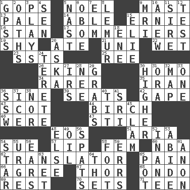 ACROSS 1. Republicans 5. Christmas carol 9. Vertical spar for supporting sails 13. Diluted with white 14. Competent 15. Bert's buddy 16. Comedian Laurel of Laurel & Hardy 17. Wine waiters 19. Like a shrinking violet 20. Had dinner 21. Corn or form start 22. Soggy 23. Fast planes 25. To separate or throw off 26. Supplementing with great effort 30. Same (prefix) 34. Less widely known 35. SW Asia republic 36. Trig term 39. Theater features 42. Stare wonderingly 43. Native of Scotland 44. A tree used for making furniture 46. We are 47. Vertical member of a panel or frame 48. Greek goddess of the dawn 51. Roberta Peters solo 54. Take to court 57. Mouth edge 58. Opposite of masc. 60. Basketball assoc. 62. Interpreter 65. Ache 66. Match 67. Son of Odin 68. Southwest Nigerian state 69. Respite 70. Puts into a specified state 71. Adolescent DOWN 1. Global Positioning Systems (abbr.) 2. Expletives 3. Live dramatic performances 4. Elected rep. 5. Political cartoonist Thomas 6. Mitch Miller's instrument 7. Shade tree 8. Arboreal primate 9. Medical imaging device (abbr.) 10. Afresh 11. The founder of a family 12. Trial 15. Writer Wiesel 18. Compass dir. 20. "____ silly question..." 24. Cigar-shaped 27. Big collection agency 28. Born 29. Takes hold of 30. Having greater elevation 31. Mouth or opening 32. Atlas unit 33. Single 36. Compass dir. 37. Frozen water 38. Not either 40. Teat (slang) 41. Indian title of respect (Mr.) 45. Dollar (slang) 48. Otherwise 49. Petroleum 50. Arguments over trivial matters 52. Lacking in sense or substance 53. Tolerate 54. Play the lead 55. Goad 56. Hearing organs 58. Lowest support of a structure 59. Blunders 61. Soon (poet.) 63. Fish or hair follower 64. Definite Article 65. Plant holder