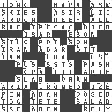ACROSS 1. Torque (variant) 5. California wine valley 9. Compass dir. 12. Atmospheres 14. SW Saudi Arabia district 15. Cards in a Roman deck? 16. Zeal 17. Coral ridge 18. 100% 19. Actress Charlotte 20. Medicinal drug used to evoke vomiting 23. Passed on 24. Austrian river, tributary to the Danube 25. Inky black, to poets 27. Grain storage tower 30. Plant holder 32. Male offspring 33. SW Asia republic 34. The sixth month of the Jewish calendar 36. Baseball player Mel 38. Scottish cap 39. Epoch 40. Eastern Standard Time (abbr.) 43. Fluid product of inflammation 46. Fast planes 48. Romantic infatuation 49. Accounting whiz (abbr.) 51. One more than two 52. Johnson of "Laugh-In" 53. Broad, flat, thick piece 54. NW Algerian seaport 56. Roberta Peters solo 58. Pressed 61. Ending with capital 64. Fenced enclosure 65. First man 66. Administered medicine 68. Coat; cloak 69. Wig 70. First course 71. Compass dir. 72. Arabian gulf 73. Trust DOWN 1. Russian ruler of old 2. Gumbo ingredient 3. Travel on an animal 4. Corporate head (abbr.) 5. Drug cop 6. Toward the sea 7. Components 8. Sandy's bark 9. Killed 10. Filth; sediment 11. Uncontrolled 13. Indian titles of respect 21. Dad 22. Eats (away) 23. Do not 24. Electrically charged atom 26. Sometimes accompanies a hiss 27. Be seated 28. Retirement account (abbr.) 29. Desk light 31. Tarsus (plural) 35. Food allowance for one day 37. Pull apart 41. Fast jet (abbr.) 42. Definite Article 44. Southern CA. univ. 45. Health resort 47. Male parent of an animal 48. Baking dish 50. Remained 53. Burn superficially 55. Sums up 56. Tenement units (abbr.) 57. Vintage cars 59. Pace 60. Sign of things to come 61. Capri or Wight 62. Ardor 63. Whirlpool 65. "One Day ___ Time" 67. Boat paddle