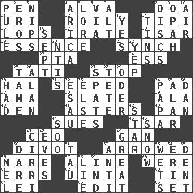 ACROSS 1. Fenced enclosure 4. Inventor's middle name 8. ___ good deed 11. RI univ. 12. Agitated, as a liquid 14. Native american tent (variation) 15. Chops off 17. Feeling or showing extreme anger 18. Austrian river, tributary to the Danube 19. Core 21. Synchronize (abbr.) 23. Parent Teacher Association (abbr.) 24. Double-curved letter 25. Jacques of French films 27. Discontinue 30. Actor Linden 31. Oozed 34. Writing tablet 37. Nanny (var.) 38. Schedule 39. In the manner of 40. Lair 41. Michaelmas daisies 43. Baking dish 44. Institutes legal proceedings 45. Russian ruler of old 47. Corporate head (abbr.) 49. Separate the seeds from cotton 50. A piece of turf (Scot.) 52. Moved like an arrow 56. Female horse 57. Place in a line 60. Past tense of be (plural) 61. Blunders 62. National forest in Provo, Utah 63. Metal container 64. Flowery wreath 65. Prepare for publication 66. Put into a specified state DOWN 1. Whine 2. Greek god of love 3. Cuts off 4. N. Chile seaport 5. Old wives' tales, e.g. 6. By way of 7. The first octave above the treble staff 8. Plates 9. Brightly colored fish 10. Wind 13. Consenting reply 14. Metal containers 16. Back-to-school mo. 20. Nuclear Threat Initiatives 22. Slangy assent 25. Docile 26. Actor Alda or Thicke 27. Arguments over trivial matters 28. False hair 29. Baltic tributary 30. Possessed 32. Son of Isaac 33. Otherwise 34. Dad 35. Having or resembling wings 36. One of the 12 tribes of Israel 42. Play the lead 44. "Barney Miller" actor Jack 46. Overwhelm 47. High-altitude cloud 48. Nights before holidays 49. Relatively large 50. Have the gumption 51. The 19th letter of the Greek alphabet 52. Opposed to 53. Moistens 54. One of the Great Lakes 55. Incision 56. Cartoonist voice _ Blanc 58. Whopper 59. Indiana (abbr.)