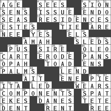 ACROSS 1. Grow older 4. Perceives with the eye 8. The Jewish people; Israel 12. Elected reps. 14. Come out of 16. Inside; within (prefix) 17. Oceans 18. Homes 20. _____ Park, CO 22. Standoff 23. "We ___ not amused" (Victoria) 24. Born 25. Affirmative reply 28. Raised railways 30. Wet nurse 31. Bobsleighs 35. Fluid product of inflammation 37. Title for a man of rank and authority 40. Margarine 41. Draw slowly or heavily 42. Wear away 44. Baking dishes 45. Brightly colored fish 46. Frog relative 47. Followers of ems 48. Insides of hands 50. Grant temporary use of 52. Small island 54. Compass dir. 55. Sliced dessert 58. Call ___ day 61. Directed 63. Erodes 65. Parts 70. Petty quarrel 71. Supplements with great effort 72. Natives or inhabitants of Denmark 73. False hair 74. Gouge 75. Monthly bill 76. To sift DOWN 1. NE Netherlands city 2. Honkers 3. Related on the mother's side 4. Title for a knight 5. Compass dir. 6. Curvy letter 7. Set or collection 8. Elected rep. 9. South American Indian 10. River in Europe 11. Sense of smell 13. Compass dir. 15. Singer Brickell 19. Snakelike fish 21. Symbol (abbr.) 26. Relaxation 27. Chest covering 29. Had an oblique or slanted direction 30. Respiratory problem 32. Flair 33. Hiding places for outlaws 34. Mayday 35. Dad 36. Mountain range 38. Friend of Pooh 39. Peak District village in England 41. Police officer (slang) 43. Locale of original sin 49. Grain storage tower 51. ___ Haven, CT 53. Be inclined (to) 55. Some stationery 56. Feeling or showing extreme anger 57. First name in cosmetics 58. On the rocks 59. Puff or smoke 60. So be it 62. Letter starter 64. Eastern Standard Time (abbr.) 66. Pacific Standard Time (abbr.) 67. Compass dir. 68. Nine, plus one 69. Fast jet (abbr.)