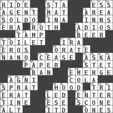 ACROSS 1. Travel on an animal 5. R.R. building 8. Double-curved letter 11. Representative 13. Floor covering 14. Length times width 15. Twentieth part of a lira 16. _ tizzy (2 wds.) 17. Restaurants 18. Period 19. Writer of Portnoy's Complaint (1969) 21. Goodbye (Sp.) 22. Pack (down) 24. Fermented drink made from hops 25. Bathroom 27. Lyricist Gershwin 29. Greek god of love 30. Speak pompously 32. Billionth: prefix 33. Desist 35. "____ silly question..." 39. Some stationery 41. Proofreading order 42. Bar 43. Develop 45. Hindu god of fire 48. Root beer relative 49. Small fatty European fish 50. Parka part 52. Three (prefix) 55. Part of Q.E.F. 56. Directed 57. Keyboard key 59. Prong on a fork 60. Compass dir. 61. Biscuitlike quick bread 62. The first octave above the treble staff 63. It would 64. Washington bills DOWN 1. Raze (variant) 2. Composer Stravinsky 3. Accusation by an informer 4. Conclusion 5. Stricken, poetically 6. Hyperbolic tangent 7. _ moment's notice (2 wds.) 8. Bert's buddy 9. Sir (Sp.) 10. Backtalk 12. Singer Mel 14. Assistant 20. Elect 21. Blind as ____ 23. Columnist Joseph or Stewart 25. "___ Little Indians" 26. Mouth or opening 27. Big collection agency 28. Actress Charlotte 30. Boat paddle 31. Artist's stand 33. Tax preparer (abbr.) 34. Car or cant ending 36. Ski resort town in Vermont 37. Barrel 38. Had dinner 40. "This won't hurt ____!" 43. Environmental prefix 44. Methods 45. Showery time 46. Monetary aid 47. Nathan's nickname 49. Stalk of a moss capsule 50. Command 51. Wrote a lyric poem 53. French philosopher Descartes 54. Angers 56. Flowery wreath 58. Non-commissioned officer (abbr.)