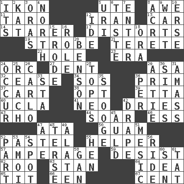 ACROSS 1. Visual representation of an object 5. Shoshoni 8. Deep reverence 11. Edible starchy tuberous root 12. SW Asia republic 13. Automobile 14. A viewer who gazes fixedly 17. What propaganda does 19. Disco prop 21. Cylindrical with tapered ends 22. Opening into or through something 23. Period 24. The grampus (Milton) 27. Gouge 29. White ___ sheet 32. Stop 34. Distress signal 36. Demure 37. Draw slowly or heavily 38. Choose 39. Singer James 40. Southern CA. univ. 41. Modern: prefix 42. Frees from moisture 43. 17th letter of the Greek alphabet 44. Fly high 46. Curvy letter 47. "One Day ___ Time" 50. Island territory of the United States 52. Soft color 55. Aide 57. Electrical Measurement 59. Cease 62. Friend of Pooh 63. Comedian Laurel of Laurel & Hardy 64. It may be bright or harebrained 65. Teat (slang) 66. Car or cant ending 67. Penny DOWN 1. ___ a Wonderful Life 2. Krazy ___ of comics 3. Mouths or openings 4. Compass direction 5. RI univ. 6. Clothes sense 7. Keyboard key 8. Measure of real estate 9. Electrical Unit 10. Celtic language 12. Binary compound 15. Wear away 16. Hero or heavy, e.g. 18. Mouth or opening 20. Gillaume's butler role 24. Come to pass 25. Arrive at 26. Monte _, Las Vegas Hotel/Casino 28. Drinks excessively 29. Nick name for Arthur 30. Locates 31. Collect or gather 33. R.R. building 35. Moe Howard, for one 36. For each 42. Window treatment 45. Old (Scot.) 47. Had dinner 48. Laconic 49. Having winglike extensions 51. Of or pertaining to a meson 52. Piece 53. Mine, in Marseilles 54. Specific locale 55. Layer 56. Travel on or in a vehicle 58. Separate the seeds from cotton 60. Elected rep. 61. Make lace