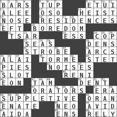 ACROSS 1. Soap units 5. Uncastrated adult male sheep 8. Needle holder 12. Toward shelter 13. Bear (Spanish) 14. Robbery 15. Sense of smell 16. Homes 19. Lizard (obsolete) 20. Mood resulting from idleness 21. Russian ruler of old 23. Double-curved letter 24. Police officer (slang) 27. Oceans 30. Habitations of wild animals 31. Disco prop 34. Arches 35. Jai ____ 38. Singer Mel 40. Proofreading order 41. Sliced desserts 42. Annoying sounds 44. Position in a hierarchy or organization 45. Painter Guido (1575-1642) 46. Age 47. Scottish cap 50. Incision 53. Speakers 57. Epoch 59. Supplementary 63. Northwest Algerian city 64. Maternal 65. Modern: prefix 66. Enthusiastic 67. Opera by Verdi 68. Followers of ems 69. Depend DOWN 1. Object of repulsion 2. High up in or into the air 3. Musical pauses 4. Perceive with the eye 5. "Corrida" creature 6. One who uses or employs something 7. Airs 8. Car or cant ending 9. Nervous spasm 10. Purpose 11. ___ a Wonderful Life 14. Is hesitant and indecisive 17. Binary compound 18. Two (Sp.) 20. Cy Young winner Saberhagen 22. Aid 24. Certainty 25. At one time in the past 26. Inconspicuous attention getter 28. Tate display 29. Within a short period 30. Hyrax 32. Sis' sibling 33. Arab leader 35. Domed church section 36. _ and Stitch 37. A really long time 39. Compass dir. 43. Extremities 47. Lacquered or enameled metalware 48. "We ___ not amused" (Victoria) 49. Floor covering 51. Impudent aggressiveness 52. Get behind 54. Prong on a fork 55. Baking chamber 56. Vintage cars 58. Actor Griffith 59. Ocean 60. Single; one (prefix) 61. Writing tablet 62. Parent Teacher Assoc. 63. Boat paddle