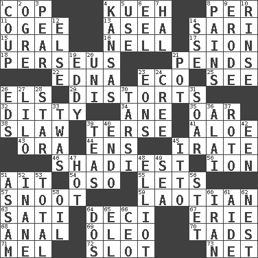 ACROSS 1. Police officer (slang) 4. Malaysian steamed pastry 8. For each 11. Double curve, resembling the letter S 13. At sea 14. Indian skirt 15. Mountain range 16. 1994 drama film starring Jodie Foster 17. The Jewish people; Israel 18. Son of Zeus who helped slay Medusa 21. Hangs 22. Pulitzer Prize-winning author Ferber 23. Environmental prefix 25. Perceive with the eye 26. Raised railways 29. What propaganda does 32. Short, simple song 34. A saturated hydrocarbon 35. Boat paddle 38. Cole _ (cabbage dish) 39. Laconic 41. Medicinal plant 43. Mouth or opening 44. Followers of ems 45. Feeling or showing extreme anger 46. Most questionable 50. Electrically charged atom 51. Small island 54. Bear (Spanish) 55. Allows 57. Snob 59. Of or relating to Laos or its people 63. Suttee (variant) 64. Tenth: prefix 67. One of the Great Lakes 68. Of or related to the anus 69. Butter sub 70. Bits 71. Cartoonist voice _ Blanc 72. Slit 73. Fish or hair follower DOWN 1. Clever action or accomplishment 2. Legendary monster 3. Lightbulb-shaped fruit 4. Sunflower state 5. Purpose 6. Snakelike fish 7. Actor Linden 8. Aches 9. Eat (away) 10. Wash lightly 12. Otherwise 14. Compass dir. 19. Whirlpool 20. University (slang) 21. Plant holder 23. Immeasurably long periods of time 24. Algonquian 26. Begley and Asner 27. _ and Stitch 28. Play the lead 30. Tarsus (plural) 31. Fly high 33. It was, poetically 36. Jai ____ 37. Printing process, for short 39. Afternoon social gatherings 40. Inside; within (prefix) 42. Car or cant ending 45. "Tell ____ the Marines!" 47. Being at a high temperature 48. American author Paul (1891-1958) 49. Ocean 51. Indian state 52. Empty; void 53. "_____ Recall" 56. Proofreading order 58. Petroleum 60. SW Asia republic 61. Assistant 62. A home for chicks 64. Two (Sp.) 65. Pipe bend 66. Corporate head (abbr.)