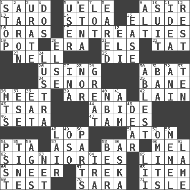 ACROSS 1. Saudi Arabian king (1953-1964) 5. Ubangi River tributary 9. SW Saudi Arabia district 13. Pacific island yam 14. Portico 15. Evade 16. Mouths or openings 17. Pleas 19. Cooking vessel 20. Epoch 21. Raised railways 22. Make lace 23. 1994 drama film starring Jodie Foster 25. Pass on 26. Exploiting 30. Blind as ____ 34. Sir (Sp.) 35. Object of repulsion 36. Confront 39. Sports stadium 42. (Had) reclined 43. Russian ruler of old 44. Remain 46. Stalk of a moss capsule 47. Makes less strong or intense 48. Trim (branches) 51. Smallest unit of an element 54. Parent Teacher Assoc. 57. White ___ sheet 58. Oblong piece of solid material 60. Cartoonist voice _ Blanc 62. Seigniories (variant) 65. Pale green bean 66. Scornful expression 67. Long journey 68. A whole individual unit 69. Trial 70. "Two Mules for Sister ____" 71. Small island DOWN 1. Close up, plug up 2. Composer Copland 3. A salt of uric acid 4. Two (Sp.) 5. One who makes use of a thing 6. Inactive volcano in Sicily 7. Car dealer's back yard 8. Having ears or earlike features 9. The first octave above the treble staff 10. Set of matching outer garments 11. The content of cognition 12. Respite 15. Relaxation 18. Connecticut Ivy Leaguer 20. Otherwise 24. A period of five years 27. _ tizzy (2 wds.) 28. Not either 29. Relatively large 30. Most capable 31. Sound made by sheep 32. Black tropical American cuckoo 33. "___ Little Indians" 36. Mountains (abbr.) 37. Compass dir. 38. Erode 40. Basketball assoc. 41. Direct toward a target or goal 45. Letter starter 48. Den 49. Bear (Spanish) 50. Pieces 52. Leaves out 53. Klaipeda city 54. Inconspicuous attention getter 55. Prong on a fork 56. Eons 58. Fermented drink made from hops 59. "____ silly question..." 61. Unable to walk 63. Fish or hair follower 64. Retirement account (abbr.) 65. Cards in a Roman deck?