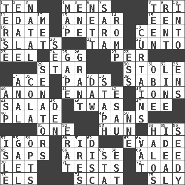 ACROSS 1. Nine, plus one 4. Not women's 8. Three (prefix) 11. Dutch treat 13. Approach 15. Car or cant ending 16. Pace 17. Stone: prefix 18. Penny 19. Narrow boards 21. Scottish cap 22. To (old English) 23. Snakelike fish 24. Oval reproductive body of a fowl 27. For each 29. Play the lead 30. Took without asking 34. Adept person 36. Groovy apts. 39. Unit of acoustic absorption 40. Soon (poet.) 41. Related on the mother's side 43. Charged atoms 44. First course 46. It was, poetically 47. Born 48. Food holder 49. Baking dishes 51. Single 53. Attila the _ 54. Part of HMS, perhaps 57. Composer Stravinsky 60. To free from 63. Dodge 65. Plant excrements 66. Get up 69. Toward shelter 70. Allow 71. Trials 72. Frog relative 73. Raised railways 74. Scram, to a cat 75. Stealthy DOWN 1. Laconic 2. Peak District village in England 3. Brizilian seaport 4. Atlas unit 5. Compass dir. 6. Remaining after all deductions 7. "Two Mules for Sister ____" 8. Adolescent 9. Monthly bill 10. To the inside or interior of 12. Was introduced to 14. Frolic 18. Window treatments 20. Arrange properly for use 25. Stare wonderingly 26. Let have 28. Double-curved letter 29. Elected representatives 31. Mitch Miller's instrument 32. Actor's bit 33. Followers of ems 34. Of or related to the anus 35. Root beer relative 37. Simpleton 38. Staphylococcus 40. Cleo's killer 42. Son of Isaac 45. Lair 50. Compass dir. 52. Part of Q.E.F. 54. Radiant circles of light 55. Perfect 56. Shabby and untidy 57. Capri or Wight 58. Highlander 59. Chooses 61. Angers 62. Flat circle 64. Large container 67. R.R. building 68. Eastern Standard Time (abbr.)