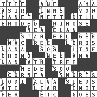 ACROSS 1. Small quarrel 5. A saturated hydrocarbon 8. Nanny (var.) 11. SW Saudi Arabia district 12. Lodging establishments 14. Promise 15. French painter Edouard 17. Remaining after all deductions 18. Deli pickle 19. Worn away 21. Full of chinks, cracks, or crevices 23. Teachers' org. 25. Liveliness 26. Play the lead 27. Snakelike fish 28. Turn to the right 31. Big _ 33. To separate or throw off 35. Domineers 37. Grandmother 38. Distress signal 40. Actor's bit 41. U. of Maine site 43. Born 45. Santa ___, CA 46. Daniel's nick name 47. Zeal 50. Unclean, religiously 52. Ancient Persian 53. "Barney Miller" actor Jack 54. Pupil covering 56. Sounds asleep 61. Farming town in central California 62. Inventor's middle name 65. Bobsleighs 66. Had dinner 67. One who doesn't tell the truth 68. Send forth 69. For each 70. And so on (abbr.) 71. Moves DOWN 1. Docile 2. Austrian river, tributary to the Danube 3. A pale, very dry sherry 4. Flintstone 5. The 18th letter of the Arabic alphabet 6. Compass dir. 7. Main course 8. Advice 9. Undercover agent 10. Leather borer 13. Vertical member of a panel or frame 16. Portable shelter 18. Spanish title 20. Letter starter 22. Shopping center 24. Ancient Greek god of war 26. Examine minutely or intensely 28. Smile widely 29. Pulitzer Prize-winning author Ferber 30. Compass dir. 31. Hindu Mythology: god of death 32. Soon (poet.) 34. Age 36. Norwegian king 37. Dreamland 39. Arranges properly for use 42. Baking chamber 44. Greek god of love 48. Standard of perfection 49. Ear of corn 51. Immeasurably long periods of time 52. Medical imaging device (abbr.) 54. ____ d'Azur (French Riviera) 55. River in Europe 57. Cassini of fashion 58. San ____ (Riviera town) 59. Singer Brickell 60. Fast planes 61. Pet locale 63. Large container 64. Curve