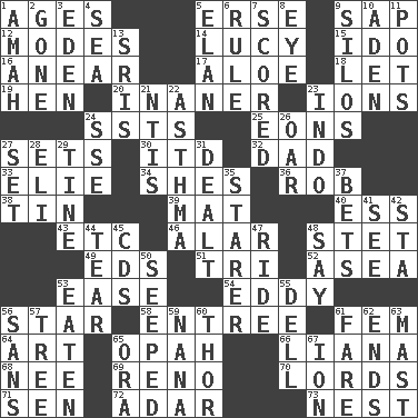 ACROSS 1. Ripens 5. Celtic language 9. Plant excrement 12. Methods 14. "I Love _" 15. Wedding promise 16. Approach 17. _ vera 18. Allow 19. Layer 20. Sillier 23. Charged particles 24. Fast planes 25. Immeasurably long periods of time 27. Arranges properly for use 30. It would 32. Male parent 33. Writer Wiesel 34. "______ My Girl" (Turtles hit) 36. Director Reiner 38. Metal container 39. Floor protector 40. Double-curved letter 43. And so on (abbr.) 46. Having or resembling wings 48. Proofreading order 49. Begley and Asner 51. Three (prefix) 52. At sea 53. Relaxation 54. Whirlpool 56. Play the lead 58. Main course 61. Opposite of masc. 64. Tate display 65. Brightly colored fish 66. Climbing, woody, usually tropical vines 68. Born 69. Former U.S. Attorney General Janet 70. Domineers 71. Elected rep. 72. The sixth month of the Jewish calendar 73. A home for chicks DOWN 1. Nanny 2. Went 3. Paradise 4. Ocean 5. Style 6. Governing power 7. Tallied 8. Sight organ 9. Grain storage towers 10. An important port of Yemen 11. Plant holders 13. Indian titles of respect 21. Nuclear Threat Initiatives 22. Respiratory problem 23. _ china 24. Compass dir. 26. Rowing implement 27. Put into a specified state 28. Connecticut Ivy Leaguer 29. Prong on a fork 31. Started a card game 35. A viewer who gazes fixedly 37. Antes 41. Observe 42. R.R. building 44. Rend 45. Music discs 47. Travel on or in a vehicle 48. Declare 50. Oozed 53. Consumed 55. Small valley 56. Without 57. Woody plant 59. Nanny 60. Son of Odin 61. Conductor's collection 62. Conclusions 63. Vertical spar for supporting sails 65. Mouth or opening 67. Electrically charged atom