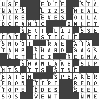 ACROSS 1. Purpose 4. Singer Brickell 8. R.R. building 11. Negative votes 13. Belonging to Elizabeth 14. Anneal 15. Hoop that covers a wheel 16. Nights before holidays 17. Rounded earthenware pot or jar 18. Pertaining to the sea 21. A small or young owl 22. Religious group 23. Cards in a Roman deck? 25. Compass dir. 26. Ingest 29. A testis 32. Snob 34. Actress Charlotte 35. _ moment's notice (2 wds.) 38. Pack (down) 39. Broken piece 41. Droops 43. Allow 44. Luau accessory 45. Canadian anthropologist Darnell 46. Tchaikovsky ballet 50. Small drink 51. Mountains (abbr.) 54. It is 55. Trig term 57. Eroded 59. Orator 63. Inky black, to poets 64. Native american tent (variation) 67. Make new 68. Drink excessively 69. Lyric poems 70. Stitch closed the eyes of (a falcon) 71. Distress signal 72. Left 73. Compass dir. DOWN 1. To (old English) 2. Ketch in the Levant 3. Jane of fiction 4. Opts 5. HTML Container Element 6. Ending with capital 7. Curvy letter 8. Makes a sale 9. Falsehoods 10. Having winglike extensions 12. Oceans 14. Immediately 19. Remaining after all deductions 20. Frozen water 21. Lubricate 23. One who doesn't tell the truth 24. On the rocks 26. Eastern Standard Time (abbr.) 27. Of or related to the anus 28. Heavy book 30. Lag or linger behind 31. Relaxation 33. Chooses 36. Labels 37. Hindu god of fire 39. Narrow board 40. Coop moms 42. Plant excrement 45. French philosopher Descartes 47. Victory 48. Help 49. Monetary unit of Laos 51. Confronts 52. Off limits 53. Halts 56. Hearing organs 58. Compass dir. 60. Peachy ____! 61. Locale of original sin 62. Hero or heavy, e.g. 64. Pull behind 65. Binary compound 66. Animal enclosure