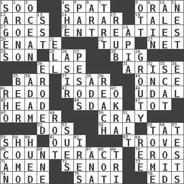 ACROSS 1. "Barney Miller" actor Jack 4. Petty quarrel 8. Northwest Algerian city 12. Arches 14. Ethiopian city, capital of Harari 16. Lie 17. Moves 18. Pleas 20. Maternal 22. Uncastrated adult male sheep 23. Fish or hair follower 24. Male offspring 25. Infant locale 28. Of large size 30. Otherwise 31. Get up 35. Oblong piece of solid material 37. Austrian river, tributary to the Danube 40. Single time 41. Redecorate 42. Cowboy competition 44. Hereditary estate 45. Froth on beer 46. Neighbor of Neb. 47. Small child 48. Channel Islands abalone 50. Supercomputer manufacturer 52. Two (Sp.) 54. Actor Linden 55. Make lace 58. Quiet! 61. Fr. "Yes" 63. Collection of objects 65. Frustrate 70. Greek god of love 71. So be it 72. Sir (Sp.) 73. Send forth 74. Connecting point 75. Suttee (variant) 76. Begley and Asner DOWN 1. Gurus 2. U. of Maine site 3. Sea 4. A female animal or person 5. Baking dish 6. Nonscientific branch of learning 7. Small pie 8. Baseball player Mel 9. Precipitation 10. Toward shelter 11. A home for chicks 13. Fast jet (abbr.) 15. Reuben's nickname 19. Capital of Western Samoa 21. Pipe bend 26. SW Saudi Arabia district 27. Mexican monetary units 29. Cross 30. Eaten away 32. _ china 33. Jazz singing style 34. Snakelike fish 35. Fermented drink made from hops 36. First man 38. Say or write further 39. Arrive at 41. 17th letter of the Greek alphabet 43. Gumbo ingredient 49. Carrot, for example 51. Keyboard modifier key 53. Takes to court 55. Singer Mel 56. Prevent from happening 57. Trials 58. Examine hastily 59. Like (prefix) 60. Took on color 62. Angers 64. To separate or throw off 66. Compass dir. 67. Santa ___, CA 68. Small bed 69. Three (prefix)