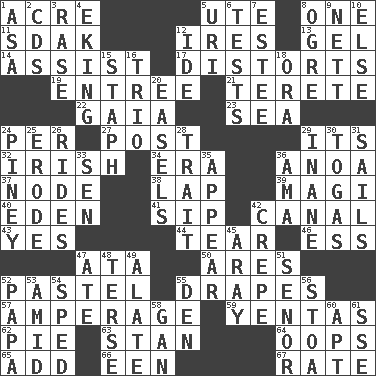 ACROSS 1. Land measure 5. Shoshoni 8. Single 11. Neighbor of Neb. 12. Angers 13. Set 14. Help 17. What propaganda does 19. Main course 21. Cylindrical with tapered ends 22. Greek goddess of the earth (variant) 23. Ocean 24. For each 27. Mail 29. It is 32. From or relating to Ireland 34. Epoch 36. Small Philippine buffalo 37. Thickened enlargement 38. Pet locale 39. Wise men 40. Paradise 41. Small drink 42. Lessep's creation 43. Affirmative reply 44. Rend 46. Curvy letter 47. _ moment's notice (2 wds.) 50. Ancient Greek god of war 52. Soft color 55. Window treatments 57. Electrical Measurement 59. Gossips 62. Sliced dessert 63. Comedian Laurel of Laurel & Hardy 64. I made a mistake 65. Say or write further 66. Car or cant ending 67. Assign a rank or rating to DOWN 1. White ___ sheet 2. Music discs 3. Raze (variant) 4. Supplementing with great effort 5. RI univ. 6. Trials 7. First name in cosmetics 8. Legendary monster 9. Remaining after all deductions 10. Otherwise 12. Binary compound 15. Staphylococcus 16. Musical group of three 18. Mouth or opening 20. Artist's stands 24. Abounding in pines 25. Wear away 26. Amusement-park features 28. Distinguishing feature 29. Lacking in sense or substance 30. Ancient Roman robes 31. Moves on water 33. Elected rep. 35. Seem 36. Nursemaid (var.) 42. Streamer paper 45. Like ___ of sunshine 47. Had dinner 48. Laconic 49. Having winglike extensions 51. Sir (Sp.) 52. Dad 53. Among 54. Drove too fast 55. Lair 56. Portico 58. Separate the seeds from cotton 60. Fitting 61. Compass dir.
