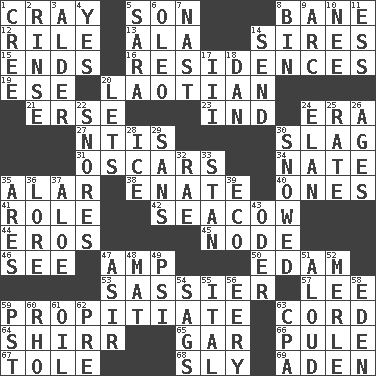 ACROSS 1. Supercomputer manufacturer 5. Male child 8. Object of repulsion 12. Cause heat under the collar 13. Insect wing 14. Titles for men of rank and authority 15. Extremities 16. Homes 19. Compass dir. 20. Of or relating to Laos or its people 21. Celtic language 23. Indiana (abbr.) 24. Epoch 27. Nuclear Threat Initiatives 30. Volcanic refuse 31. Motion picture awards 34. Nathan's nickname 35. Having or resembling wings 38. Maternal 40. Singles 41. Hero or heavy, e.g. 42. Manatee 44. Greek god of love 45. Thickened enlargement 46. Perceive with the eye 47. Electrical Unit 50. Dutch treat 53. More lively and spirited 57. Area sheltered from the wind 59. Appease 63. Drawstring 64. Bake eggs in their shells 65. Slender fish 66. Whimper 67. Lacquered or enameled metalware 68. Roguish 69. An important port of Yemen DOWN 1. Algonquian 2. Remove soap 3. Tree or shrub in the Birch family 4. Consenting reply 5. "Two Mules for Sister ____" 6. Butter sub 7. Political cartoonist Thomas 8. Storage container 9. Curve 10. Born 11. Curvy letter 14. Transmit 17. One more than two 18. Daniel's nick name 20. Allows 22. Sounds asleep 24. Liveliness 25. Assign a rank or rating to 26. Eras 28. Frozen water 29. Without 30. Overwhelmed 32. Actress Charlotte 33. Comedian Laurel of Laurel & Hardy 35. Ancient Greek god of war 36. Old wives' tales, e.g. 37. Medicinal plant 39. Environmental prefix 43. River in Europe 47. SW Saudi Arabia district 48. Floor covering 49. Air pressure measure (abbr.) 51. Verbally 52. Haggard of country music 54. Settles 55. Slanted text style (abbr.) 56. Suggestive of the supernatural 58. Locale of original sin 59. Pacific Standard Time (abbr.) 60. 17th letter of the Greek alphabet 61. Lubricate 62. Before (prefix) 63. Numbers guy (abbr.)