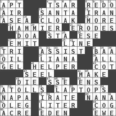 ACROSS 1. Fitting 4. Russian ruler of old 8. Make new 12. Atmosphere 13. Before Barbara or Clara 14. SW Asia republic 15. At sea 17. Hide under a false appearance 18. Greater amount 19. More overdramatic by comparison 21. Eats (away) 23. ___ good deed 24. R.R. building 26. Compass dir. 27. Send forth 28. Actor's bit 30. Three (prefix) 31. Help 34. Sound made by sheep 37. Lubricate 38. Climbing, woody, usually tropical vines 39. Everything 40. Set 41. Aide 42. Small bed 43. Stitch closed the eyes of (a falcon) 44. Cause to be 46. Expire 47. Compass dir. 50. Followers of ems 51. Ringlike coral islands and reefs 54. Portable computers 57. California wine valley 58. Feeling or showing extreme anger 60. Grandmother 62. Cassini of fashion 63. 61 cubic inches 64. Gear tooth 65. 1/640 square mile 66. Genesis locale 67. She-sheep DOWN 1. Auto club (abbr.) 2. Expression of disdain 3. Excercise machine 4. Falsehoods 5. Derisive sound 6. _ moment's notice (2 wds.) 7. Libertine 8. Full of chinks, cracks, or crevices 9. Wear away 10. Have the gumption 11. Washington bills 13. _-fi 16. Mine, in Marseilles 20. Floor protector 22. Monthly bill 25. Place in a line 27. One of the Great Lakes 29. Austrian river, tributary to the Danube 30. Coat; cloak 31. Toward shelter 32. Beverly of Met fame 33. Plant excrement 34. Keyboard key 35. Medicinal plant 36. The first octave above the treble staff 41. The bottom of a shoe or boot 43. Fodder prepared in a silo 44. Was introduced to 45. Soon (poet.) 46. Drug addict 48. Chalkboard 49. Ingested 51. Small Philippine buffalo 52. Baby powder 53. Drop; flow; fall 55. For each 56. Frozen precipitation 59. To free from 61. Mature