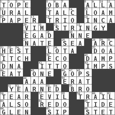 ACROSS 1. Drink excessively 5. Chief or king in Benin or Nigeria 8. Silent film actress Nazimova 12. Mountain range 13. Baby powder 15. Rich soil 16. Some stationery 18. Musical group of three 19. South American Indian 20. Zeal 22. Slender, wiry 24. Mild oath 26. Compass dir. 27. Nathan's nickname 28. Ocean 29. Curve 32. Command 35. Globular water bottle used in Asia 37. ___ good deed 38. Hankering 39. Environmental prefix 40. Moist 41. Heredity factor (abbr.) 42. "Tell ____ the Marines!" 43. Naughty children 44. Consume 45. Single 46. Republicans 49. American Automobile Association (abbr.) 50. Part of Q.E.F. 51. Had a strong desire 55. Sis' sibling 56. Lacerate 57. Tending to cause great harm 59. Lag or linger behind 63. In addition 64. Redecorate 65. Periodic rise and fall of the sea level 66. Small, secluded valley 67. Small drink 68. Proofreading order DOWN 1. Uncastrated adult male sheep 2. Mouth or opening 3. Infant food 4. Veterans Day date 5. Baseball player Mel 6. Soap units 7. Set down 8. Place in a line 9. Yearn 10. Made of lace 11. Wet nurse (var.) 14. Pupil covering 17. Capital of Latvia 21. Floor protector 23. _ tizzy (2 wds.) 25. Erase 28. Moe Howard, for one 29. First of billions? 30. Play 31. Smile enhancers 32. Flintstone garb 33. Inactive volcano in Sicily 34. Leave at once 36. Sep. follower 40. What propaganda does 42. More lacking in sense or substance 45. Boat paddle 47. Globe 48. Role in a play 49. Composer Copland 51. Shout 52. Relaxation 53. Nights before holidays 54. "You Light Up My Life" star Conn 56. Label 58. Trim (branches) 60. Small island 61. Binary compound 62. Allow