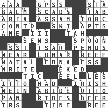 ACROSS 1. Auto club (abbr.) 4. Global Positioning Systems (abbr.) 8. R.R. building 11. Lip ointment 13. Oodles 15. Keyboard key 16. Operatic vocal solo 17. Indian state 18. Torque (variant) 19. Continued (abbr.) 21. What Jean-Claude Killy likes to do 22. Tenement units (abbr.) 23. A saturated hydrocarbon 24. One more than two 27. Scottish cap 29. Elected reps. 30. Soup utensil 34. Fast jet (abbr.) 36. Russian ruler of old 39. Depends 40. Erode 41. Type of eclipse 43. Coral ridge 44. Relating to or accompanying birth 46. Pulitzer Prize-winning author Ferber 47. Double-curved letter 48. Compose 49. Made supply last 51. Nervous spasm 53. Snakelike fish 54. French article 57. "Tell ____ the Marines!" 60. Possessed 63. From or relating to Ireland 65. Count _ (2 wds.) 66. Stay 69. "Beetle Bailey" pooch 70. Baking dish 71. Amusement-park features 72. Fermented drink made from hops 73. Big collection agency 74. Prong on a fork 75. To separate or throw off DOWN 1. Phillipine bananalike plant 2. Composer Copland 3. Place in a line 4. Girls' org. (abbr.) 5. Personal Computers (abbr.) 6. Backtalk 7. Neighbor of Neb. 8. Close up, plug up 9. Small pie 10. Lettered men learn these first 12. Floor protector 14. Stricken, poetically 18. ________ with (broke a safety seal) 20. Pass on 25. International (abbr.) 26. Come out of 28. Cleo's killer 29. Ski resort town in Vermont 31. Washington bills 32. Lyric poems 33. Science/research agcy. 34. Scorch 35. Suttee (variant) 37. Also 38. Indian princess (variant) 40. Compass dir. 42. Immoral or dissolute person 45. Flowery wreath 50. Connecticut Ivy Leaguer 52. Burn to charcoal 54. 61 cubic inches 55. First name in cosmetics 56. Dinah or Pauly 57. Body of Kaffir warriors 58. Lacerate 59. Airtight sealed metal containers 61. "This won't hurt ____!" 62. "You Light Up My Life" star Conn 64. Director Reiner 67. Lair 68. Compass dir.