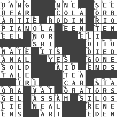 ACROSS 1. Mild oath, euphamism for damn 5. Compass dir. 8. Perceive with the eye 11. Buttocks 12. Root beer relative 14. Globe 15. Nick name for Arthur 17. "The Thinker" sculptor 18. _ de Janeiro 19. Player piano 21. Car or cant ending 22. Nine, plus one 23. Snakelike fish 24. Or not 25. Connecticut Ivy Leaguer 27. _ Lanka 28. "Beetle Bailey" pooch 31. Nathan's nickname 35. It is 37. Passed on 38. Of or related to the anus 39. Consenting reply 41. Went 42. Disposed of to a purchaser 43. Help 45. Conclusions 46. Lie 47. Afternoon social gathering 49. Three (prefix) 51. Auto 52. R.R. building 55. Mouth or opening 57. Large container 60. Speakers 62. Set 63. Indian state 65. Grain storage towers 66. Falsehood 67. Anneal 68. French philosopher Descartes 69. Followers of ems 70. Nonscientific branch of learning 71. Locale of original sin DOWN 1. Window treatment 2. Nest on high 3. Brizilian seaport 4. Amused look 5. Non-commissioned officer (abbr.) 6. Thickened enlargement 7. Writer Wiesel 8. Drawing lots 9. One of the Great Lakes 10. Inky black, to poets 13. Queen of England 1702-14 16. Immeasurably long periods of time 17. Noteworthy scarcity 20. Australian parrot (variant) 26. Cabin 29. Be inclined (to) 30. Lyric poems 31. Political cartoonist Thomas 32. Small Philippine buffalo 33. Baron Munchausen's specialties 34. A person who is older than you are 36. Ocean 40. "Cheers" or "Ellen" 44. Letter starter 48. Ancient river in northeast Turkey 50. "Terrible" tsar 52. Having a sole or soles 53. Marketplace scale 54. NE Netherlands city 55. Stare at amorously 56. It's straight from the horse's mouth 58. At sea 59. Russian ruler of old 61. Become fatigued 64. Keyboard modifier key
