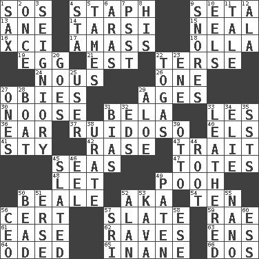 ACROSS 1. Distress signal 4. Staphylococcus 9. Stalk of a moss capsule 13. One (Scot) 14. Tarsus (plural) 15. Actress Patricia 16. One more than ninety 17. Collect or gather 18. Spanish pot 19. Oval reproductive body of a fowl 21. Eastern Standard Time (abbr.) 22. Laconic 24. Horse sense 26. Single 27. Off-Broadway awards 29. Matures 30. Trap for birds or small mammals 31. Actor Lugosi 33. French article 36. Ewer handle 37. Noisy, rowdy, vocal (Spanish) 40. Raised railways 41. Filthy place 42. To erase 43. Distinguishing feature 45. Oceans 47. Hauls 48. Allow 49. "Silly old bear" 50. Memphis, Tenn. Street 52. Alias (abbr.) 54. Nine, plus one 56. Certainty 57. Chalkboard 59. Actress Charlotte 61. Relaxation 62. All-night dance parties 63. Followers of ems 64. Wrote a lyric poem 65. Empty; void 66. Two (Sp.) DOWN 1. Saxophone 2. Single time 3. Signiory (variant) 4. R.R. building 5. Domesticates 6. Caspian sea tributary 7. Inconspicuous attention getter 8. Part of HMS, perhaps 9. Sounds asleep 10. Snakelike fish 11. Lie 12. In the manner of 20. Travels 22. Ancient Roman robes 23. Compass dir. 25. One who uses or employs something 27. Washington bills 28. Water vessel 29. _ vera 31. Prejudice 32. Begley and Asner 33. Tough but pliablecoriaceous 34. Writer Wiesel 35. Fast planes 38. A salt of uric acid 39. "Beetle Bailey" pooch 44. Carrot, for example 45. Scheduled 46. Snakelike fish 49. Eucharist need 50. Necklace unit 51. Celtic language 52. ____ Jay Lerner 53. Polynesian shrub of the pepper family 55. Billionth: prefix 56. Corporate head (abbr.) 57. _ Lanka 58. Compass dir. 60. Curvy letter