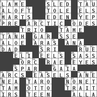 ACROSS 1. Unable to walk 5. Downhill vehicle 9. The 19th letter of the Greek alphabet 12. At or to great height 14. Lacquered or enameled metalware 15. Raised railways 16. Shops 17. Paradise 18. Slangy assent 19. Before (prefix) 20. Northern region 23. Lyric poems 24. Musical group of three 25. Docile 27. Hyperbolic tangent 30. Slender fish 32. Compass dir. 33. Medicinal plant 34. Caspian sea tributary 36. Santa ___, CA 38. Male parent 39. Indian title of respect (Mr.) 40. Sorrow 43. Connecticut Ivy Leaguer 46. Snakelike fish 48. Backtalk 49. The grampus (Milton) 51. Actress Charlotte 52. Sight organs 53. Practice fight 54. Greek goddess of the earth (variant) 56. Curves 58. Artist's stands 61. One (Scot) 64. Teachers' org. 65. Edible starchy tuberous root 66. Music written for nine 68. Scottish cap 69. "Beetle Bailey" pooch 70. Distinguishing feature 71. Big collection agency 72. Adolescent 73. Silent film actress Nazimova DOWN 1. Desk light 2. Having or resembling wings 3. Greater amount 4. Newt 5. Proofreading order 6. Farming town in central California 7. Opts 8. Lair 9. Miss Universe 1986, Barbara Palacios _ 10. Toward shelter 11. United States Postal Service (abbr.) 13. Russian ruler of old 21. Capital of Latvia 22. Unrefined 23. Sign of something about to happen 24. Definite Article 26. White ___ sheet 27. Bit 28. Wing 29. Thickened enlargement 31. More uncommon 35. Fodder prepared in a silo 37. Like ___ of sunshine 41. Purpose 42. Curvy letter 44. Chops off 45. Retirement account (abbr.) 47. Lick closed 48. Ocean 50. Cause to be 53. Fraudulent business schemes 55. Is not 56. Against 57. Buttocks 59. Johnson of "Laugh-In" 60. Within a short period 61. Of or related to the anus 62. Famous astronaut Armstrong 63. Singer James 65. Small child 67. Mouth or opening