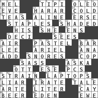 ACROSS 1. Cartoonist voice _ Blanc 4. Native american tent (variation) 8. Margarine 12. First lady 13. Ethiopian city, capital of Harari 14. Lacking warmth 15. Beverages made from leaves 17. Place in a line 18. Celtic language 19. Paper fasteners 21. Cast a shadow over 23. Part of HMS, perhaps 24. A female animal or person 26. Followers of ems 27. Tenth: prefix 28. Observes 30. Atmosphere 31. Soft color 34. Soap unit 37. Area sheltered from the wind 38. Satellite of Uranus 39. Santa ___, CA 40. Find the sum of 41. Sounds asleep 42. Police officer (slang) 43. Backtalk 44. "____ silly question..." 46. Baseball player Mel 47. Compass dir. 50. Personal Computers (abbr.) 51. Put through a sieve 54. Portable computers 57. One who doesn't tell the truth 58. Feeling or showing extreme anger 60. Falsehood 62. Johnson of "Laugh-In" 63. 61 cubic inches 64. Island 65. Fermented drink made from hops 66. Locale of original sin 67. She-sheep DOWN 1. Was introduced to 2. Nights before holidays 3. Resembling or made to resemble leather 4. Lies 5. From or relating to Ireland 6. Baking dish 7. Angers 8. Seas 9. Titled peers of a realm 10. Otherwise 11. Wrote a lyric poem 13. Actor Linden 16. Ketch in the Levant 20. 23rd letter of the Greek alphabet 22. Person who is morally reprehensible 25. First name in cosmetics 27. Passed on 29. Snakelike fish 30. According to 31. Zero-star reviews 32. Came up 33. Title for a knight 34. Keyboard key 35. Small Philippine buffalo 36. Strike 41. Suttee (variant) 43. A viewer who gazes fixedly 44. Fitting 45. Native of Scotland 46. Speak pompously 48. Chalkboard 49. Ingested 51. Thick slice 52. Become fatigued 53. The longest river in the world 55. For each 56. Cole _ (cabbage dish) 59. To free from 61. Sight organ