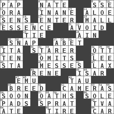 ACROSS 1. Infant food 4. Nathan's nickname 8. Compass dir. 11. Mouth or opening 12. Lacking in sense or substance 14. Medicinal plant 15. Elected reps. 17. Keyboard key 18. Promenade 19. Substance 21. Prevent from happening 23. Make a knot 24. The 18th letter of the Arabic alphabet 25. Fastener 27. Collude with 30. Call ___ day 31. A viewer who gazes fixedly 34. Baseball player Mel 37. "___ Little Indians" 38. Leaves out 39. Area sheltered from the wind 40. R.R. building 41. Makes clutter 43. Not strict 44. French philosopher Descartes 45. Austrian river, tributary to the Danube 47. Australian flightless bird 49. The 19th letter of the Greek alphabet 50. A special lineage 52. Devices for capturing images 56. Within a short period 57. Profane or obscene expressions 60. Flatfish 61. Writing tablets 62. Small fatty European fish 63. Federal power corp. 64. Had dinner 65. Become fatigued 66. 4-wheeled motor vehicle DOWN 1. Airs 2. Ancient Greek god of war 3. Baking dishes 4. Sibling's daughter 5. Singer Murray 6. Make lace 7. Compass dir. 8. Killed 9. Disposed of to a purchaser 10. Snakelike fish 13. Period 14. Mine, in Marseilles 16. Stalk of a moss capsule 20. Cuts off 22. Large container 25. Proofreading order 26. Grandmother 27. Ascend 28. Antes 29. Celtic language 30. ___ a Wonderful Life 32. Heavy book 33. So be it 34. Water jar 35. Separate forcefully 36. John Ritter's dad 42. Thailand, formerly 44. Sorrow 46. Takes to court 47. Eat (away) 48. Not women's 49. Clothes sense 50. Water vessel 51. Two (Sp.) 52. Burn to charcoal 53. College mil. group 54. Inventor's middle name 55. Singe 56. Health resort 58. Fitting 59. Three (prefix)