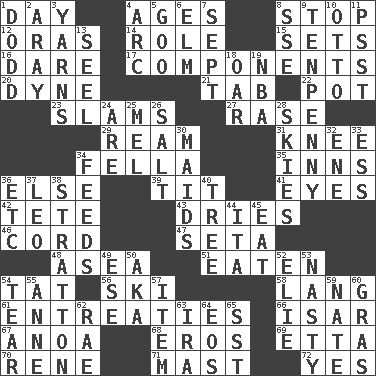 ACROSS 1. 24 hours 4. Matures 8. Close up, plug up 12. Mouths or openings 14. Hero or heavy, e.g. 15. Arranges properly for use 16. Have the gumption 17. Parts 20. Unit of force 21. Bar bill 22. Plant holder 23. Hits or strikes with great force 27. To erase 29. 480, 500 or 516 sheets of paper 31. Leg joint 34. Chap (slang) 35. Restaurants 36. Otherwise 39. Teat (slang) 41. Snake ____ (dice throw) 42. Wig 43. Frees from moisture 46. Drawstring 47. Bristle 48. At sea 51. Eroded 54. Make lace 56. What Jean-Claude Killy likes to do 58. Austrian-born American filmmaker Fritz 61. Pleas 66. Austrian river, tributary to the Danube 67. Small Philippine buffalo 68. Greek god of love 69. Singer James 70. French philosopher Descartes 71. Vertical spar for supporting sails 72. Consenting reply DOWN 1. Texas town _ City 2. Like ___ of sunshine 3. Entertaining tales 4. Curve 5. Thick or sticky substance 6. Shade tree 7. Back-to-school mo. 8. Compass dir. 9. 3-inch nail 10. Von Bismarck 11. Inconspicuous attention getter 13. Sew up the eyelids of hawks and falcons 18. Rowing implement 19. Basketball assoc. 24. "We ___ not amused" (Victoria) 25. Cartoonist voice _ Blanc 26. Table seasoning 28. Atmospheres 30. Women servants 32. Compass dir. 33. Double-curved letter 34. Eats 36. And so on (abbr.) 37. Lion 38. Ski resort town in Vermont 40. Woody plant 44. Call ___ day 45. Consume 49. Compass dir. 50. Alias (abbr.) 52. Writer Wiesel 53. Difficult 54. Pull apart 55. Queen of England 1702-14 57. A whole individual unit 59. Nathan's nickname 60. Pate de foie ____ 62. Actress Charlotte 63. Retirement account (abbr.) 64. Greek goddess of the dawn 65. Fast jet (abbr.)