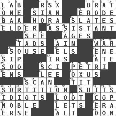 ACROSS 1. Experiment locale 4. Acura sports coupe 7. Naughty child 11. Single 12. Thailand, formerly 13. Eat (away) 14. Sound made by sheep 15. Israeli folk dance 16. Chalkboards 17. A person who is older than you are 19. Aide 21. Observe 23. Grows older 24. Small boys 25. The 18th letter of the Arabic alphabet 26. Armed conflict 29. Lush 30. Raised railways 31. Compass dir. 32. Small drink 33. Big collection agency 34. Had dinner 35. "Barney Miller" actor Jack 36. _-fi 37. _ dish (used to culture cells) 40. Followers of ems 41. Area sheltered from the wind 42. The longest river in Central Asia 43. Examine hastily 45. Teat (slang) 46. Casting lots 51. Costumes for special activities 55. Foolish or stupid persons 56. Plunder 58. Police officer (slang) 59. Having high moral qualities 60. Allows 61. Period 62. Celtic language 63. Keyboard modifier key 64. Spanish title DOWN 1. Ear part 2. Of or related to the anus 3. Necklace unit 4. _ de Janeiro 5. "Two Mules for Sister ____" 6. Dec. holiday 7. Naughty children 8. Roll call or roster of names 9. Arabian gulf 10. Trial 12. Tears up 13. Otherwise 16. Signals 18. Son of Isaac 20. Travel by water 22. Compass dir. 24. Literary convention 25. Nest on high 26. Puts on (as clothing) 27. Opposed to 28. Portuguese money of account (variant) 29. The Jewish people; Israel 32. Compass dir. 33. Ancient Celtic tribe of eastern Britain 36. Narrow boards 37. Cooking vessel 38. Is 39. Ballerina skirt 43. Fur scarf 44. Quote 46. Trig term 47. Scent 48. Teases 49. Rounded earthenware pot or jar 50. Christmas carol 52. On the rocks 53. "Corrida" creature 54. Connect, as a bridge 57. Baseball player Mel