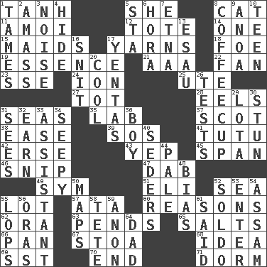 ACROSS 1. Hyperbolic tangent 5. A female animal or person 8. Domesticated feline 11. Mine, in Marseilles 12. Haul 14. Single 15. Unmarried girls 17. Entertaining tales 18. Enemy 19. Gist 21. American Automobile Association (abbr.) 22. Avid follower 23. Compass dir. 24. Electrically charged atom 25. Shoshoni 27. Small child 28. Snakelike fish 31. Oceans 35. Experiment locale 37. Highlander 38. Relaxation 39. Mayday 41. Ballerina skirt 42. Celtic language 43. Slangy assent 45. Connect, as a bridge 46. Sever or remove by pinching or nipping 47. Apply (a substance) by light strokes 49. Symbol (abbr.) 51. Connecticut Ivy Leaguer 52. Ocean 55. Car dealer's back yard 57. "One Day ___ Time" 60. Thinks logically 62. Mouth or opening 63. Depends 65. Table seasonings 66. Baking dish 67. Portico 68. The content of cognition 69. Fast jet (abbr.) 70. Conclude 71. Dormintory (informal) DOWN 1. Softens 2. Collect or gather 3. Annoying sound 4. Flintstone garb 5. R.R. building 6. Israeli folk dance 7. Inactive volcano in Sicily 8. Java holder (2 wds.) 9. Small Philippine buffalo 10. Adolescent 13. He sold his birthright 16. In a ____ (agitated or irritated) 17. Gossips 20. Calm and collected 26. Trials 29. Globular water bottle used in Asia 30. Make senseless or dizzy 31. Perceives with the eye 32. Merit 33. Aide 34. Not well drained, as in land 36. Male child 40. Spring feasts 44. Light colored 48. Prejudice 50. Atlas contents 52. Twentieth part of a lira 53. Keyboard key 54. Indian state 55. Chops off 56. Mouths or openings 58. Wig 59. Soon (poet.) 61. Expressed in words 64. Male parent