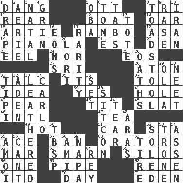 ACROSS 1. Mild oath, euphamism for damn 5. Baseball player Mel 8. Three (prefix) 11. Posterior 12. Water vessel 14. Rowing implement 15. Nick name for Arthur 17. Role for Stallone 18. White ___ sheet 19. Player piano 21. Eastern Standard Time (abbr.) 22. Lair 23. Snakelike fish 24. Or not 25. Greek goddess of the dawn 27. _ Lanka 28. Smallest unit of an element 31. Baby powder 35. It is 37. Lacquered or enameled metalware 38. The main thing one is thinking about 39. Affirmative reply 41. Opening into or through something 42. Lightbulb-shaped fruit 43. Teat (slang) 45. Narrow board 46. International (abbr.) 47. Beverage made from leaves 49. Being at a high temperature 51. Auto 52. R.R. building 55. Adept person 57. Bar 60. Speakers 62. Third mo. 63. Excessive but superficial compliments 65. Grain storage towers 66. Single 67. Corncob 68. French philosopher Descartes 69. It would 70. 24 hours 71. Genesis locale DOWN 1. Window treatment 2. Nest on high 3. Brizilian seaport 4. Broad smile 5. Chief or king in Benin or Nigeria 6. Heavy book 7. Bar bills 8. Inedible or poisonous agaric 9. To erase 10. SW Asia republic 13. Lug 16. Immeasurably long periods of time 17. Noteworthy scarcity 20. Australian parrot (variant) 26. Expletives 29. Water jar 30. Confront 31. Native american tent (variation) 32. An important port of Yemen 33. Tough but pliablecoriaceous 34. Monte _, Las Vegas Hotel/Casino 36. Arrange properly for use 40. "Cheers" or "Ellen" 44. Pull into pieces 48. Ancient river in northeast Turkey 50. Cook's measure (abbr.) 52. Having a sole or soles 53. Marketplace scale 54. NE Netherlands city 55. Mine, in Marseilles 56. Patter 58. Among 59. California wine valley 61. Become fatigued 64. Marina Del _, California