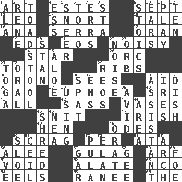 ACROSS 1. Tate display 4. _____ Park, CO 9. Back-to-school mo. 13. Lion 14. Derisive sound 15. Story 16. Santa ___, CA 17. Spanish missionary in California 18. NW Algerian seaport 19. Begley and Asner 21. Greek goddess of the dawn 22. Annoyingly loud 24. Play the lead 26. The grampus (Milton) 27. Add up to 29. Teases 30. U. of Maine site 31. Observes 33. Assist 36. E Mali city 37. Normal relaxed breathing 40. Indian title of respect (Mr.) 41. Everything 42. Backtalk 43. Flower holders 45. In a ____ (agitated or irritated) 47. From or relating to Ireland 48. Layer 49. Lyric poems 50. Lean end of the neck 52. For each 54. "One Day ___ Time" 56. Toward shelter 57. POW camp 59. Sandy's bark 61. Null 62. Having winglike extensions 63. Non-commissioned officer (abbr.) 64. Snakelike fish 65. Indian princess (variant) 66. Definite Article DOWN 1. In the manner of 2. French philosopher Descartes 3. Inedible or poisonous agaric 4. Curvy letter 5. Scornful expression 6. "Corrida" creature 7. Blunders 8. R.R. building 9. Unemotional ones 10. Hearing organs 11. Shaw product 12. Nine, plus one 20. Comedian Laurel of Laurel & Hardy 22. Annoying sound 23. Globe 25. Medicinal plant 27. Ancient Roman robe 28. Spoken 29. Vintage cars 31. Argument over a trivial matter 32. Followers of ems 33. Helper 34. Angers 35. Food container 38. Exploiting 39. Enthusiastic 44. Length times width 45. Fragments 46. Teachers' org. 49. Speak pompously 50. _ gin 51. To provide with a ceiling 52. Monetary unit of Botswana 53. Style 55. Bowlike part 56. "___ Maria" 57. Slender fish 58. Turn to the right 60. Enemy