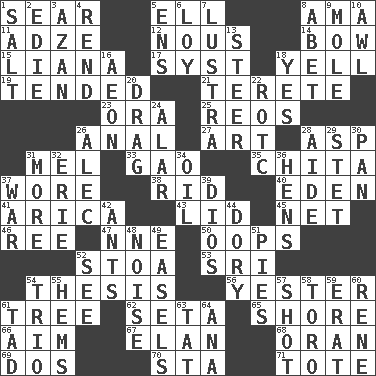ACROSS 1. Singe 5. Pipe bend 8. Wet nurse (var.) 11. Edge tool used to cut and shape wood 12. Good sense 14. Arrow shooter 15. Woody, climbing, usually tropical plant 17. System (abbr.) 18. Shout 19. Looked after 21. Cigar-shaped 23. Mouth or opening 25. Vintage cars 26. Of or related to the anus 27. Nonscientific branch of learning 28. Viper 31. Cartoonist voice _ Blanc 33. E Mali city 35. Riviera of "Kiss of the Spider Woman" 37. Had on 38. To free from 40. Paradise 41. N. Chile seaport 43. Flaplike covering 45. Fish or hair follower 46. To riddle 47. Compass dir. 50. I made a mistake 52. Portico 53. _ Lanka 54. College paper 56. Next before 61. Relationship diagram 62. Stalk of a moss capsule 65. Dinah or Pauly 66. Direct toward a target or goal 67. Enthusiasm 68. Northwest Algerian city 69. Two (Sp.) 70. R.R. building 71. Carryall DOWN 1. Table seasoning 2. Singer Brickell 3. Muslim summons to prayer 4. Tear apart 5. Followers of ems 6. Myrna of the movies 7. A period of five years 8. Collude with 9. Undercover agent 10. Leather borer 13. Bull 16. Period of immesurable duration 18. It is so 20. To draw with force 22. College mil. group 24. Having or resembling wings 26. Actor Baldwin 28. Helper 29. Proofreading order 30. Baking dish 31. Greater amount 32. 4th largest of the Great Lakes 34. Lubricate 36. Coop moms 37. Armed conflict 39. "Vaya con ____" 42. Pismires 44. Rowboat 48. Annoying sound 49. Artist's stands 51. Sliced desserts 52. Perceive with the eye 54. Musical group of three 55. Is hesitant and indecisive 57. Guess 58. "Corrida" creature 59. Part of Q.E.F. 60. French philosopher Descartes 61. Small amount or degree 63. Make lace 64. Santa ___, CA