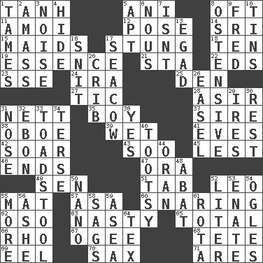 ACROSS 1. Hyperbolic tangent 5. Black tropical American cuckoo 8. Often (poetically) 11. Mine, in Marseilles 12. Introduce or present, as a question 14. _ Lanka 15. Women servants 17. Feeling sharp psychological pain 18. Nine, plus one 19. Gist 21. R.R. building 22. Begley and Asner 23. Compass dir. 24. Retirement account (abbr.) 25. Lair 27. Nervous spasm 28. SW Saudi Arabia district 31. Remaining after all deductions 35. Male child 37. The founder of a family 38. Mitch Miller's instrument 39. Dripping 41. Nights before holidays 42. Fly high 43. "Barney Miller" actor Jack 45. For fear that 46. Conclusions 47. Mouth or opening 49. Elected rep. 51. Bar bill 52. Lion 55. Floor protector 57. White ___ sheet 60. Catching in a trap 62. Bear (Spanish) 63. Offensive 65. "_____ Recall" 66. 17th letter of the Greek alphabet 67. Double curve, resembling the letter S 68. False hair 69. Snakelike fish 70. Saxophone 71. Ancient Greek god of war DOWN 1. Makes less strong or intense 2. Collect or gather 3. Annoying sound 4. Flintstone garb 5. Fitting 6. Good sense 7. Is not 8. Clearly or manifestly demonstrative 9. Flintstone 10. Canisters 13. Mild oath 16. In a ____ (agitated or irritated) 17. Manatee 20. Baby bed with high sides 26. Artist's stand 29. Angers 30. Take ten 31. Characteristic smell of wine 32. Inky black, to poets 33. Inedible or poisonous agaric 34. Laconic 36. Affirmative reply 40. A girl or young woman (variant) 44. Northwest Algerian city 48. Blind as ____ 50. Billionth: prefix 52. 61 cubic inches 53. Maternal 54. Stares 55. Greater amount 56. American tennis player Robert 58. Droops 59. Toward the sea 61. Round or rotation of duties 64. John Ritter's dad
