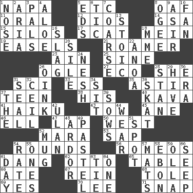 ACROSS 1. California wine valley 5. And so on (abbr.) 8. Clumsy lout 11. Spoken 12. "Vaya con ____" 14. Girls' org. (abbr.) 15. Grain storage towers 17. Leave at once 18. Chow _ 19. Artist's stands 21. Wanderer 23. The 18th letter of the Arabic alphabet 25. Trig term 26. Stare 27. Environmental prefix 28. A female animal or person 31. _-fi 33. Curvy letter 35. Moving or stirring 37. Adolescent 38. Part of HMS, perhaps 40. Polynesian shrub of the pepper family 41. Japanese verse 43. Pull behind 45. A saturated hydrocarbon 46. Pipe bend 47. Pet locale 50. 270 degrees 52. Hindu Mythology: god of death 53. Plant excrement 54. Periods in a boxing match 56. Lover boys 61. Mild oath, euphamism for damn 62. Von Bismarck 65. Eating place 66. Had dinner 67. It's straight from the horse's mouth 68. Lacquered or enameled metalware 69. It is so 70. Area sheltered from the wind 71. Fastener DOWN 1. Olfactory organ 2. Operatic vocal solo 3. Friends 4. _ vera 5. Begley and Asner 6. Nervous spasm 7. Rough 8. Double curve, resembling the letter S 9. SW Saudi Arabia district 10. Avid follower 13. Unemotional 16. Volcanic refuse 18. Madame (abbr.) 20. Drop; flow; fall 22. Small Philippine buffalo 24. Delicate 26. Pig sound 28. Comedian Laurel of Laurel & Hardy 29. Hub of activity 30. Period 31. Lick closed 32. To provide with a ceiling 34. Be seated 36. Three-handed card game 37. Definite Article 39. Sty mamas 42. Uhlan (variant) 44. Erode 48. Zeal 49. Soft color 51. Blemish 52. Java container 54. Pace 55. Singles 57. Floor coverings 58. Inky black, to poets 59. Rounded earthenware pot or jar 60. Ooze 61. 24 hours 63. Make a knot 64. Single
