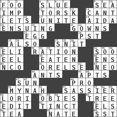 ACROSS 1. Egg _ yung 4. Change direction abruptly 8. Ocean 11. Naughty child 12. Cod relative 14. Patter 15. Allows 17. Join together 18. Opera by Verdi 19. Taking place subsequently 21. Long dresses 23. Ovum 24. Pacific Standard Time (abbr.) 25. In addition 27. In a ____ (agitated or irritated) 30. Connecticut Ivy Leaguer 31. Food allowance for one day 34. "Barney Miller" actor Jack 37. Snakelike fish 38. Consumed 39. Followers of ems 40. Non-commissioned officer (abbr.) 41. Threatening words 43. Modern: prefix 44. Pismires 45. Tenement units (abbr.) 47. Player for Phoenix 49. Adept person 50. Non-adult bird? 52. More impudent 56. Australian parrot (variant) 57. Off-Broadway awards 60. Relationship diagram 61. Prepare for publication 62. Colored lightly or faintly 63. Raised railways 64. Afternoon social gathering 65. Nathan's nickname 66. Fast jet (abbr.) DOWN 1. Do some clerical work 2. Sign of something about to happen 3. Elects 4. Feeling sharp psychological pain 5. Having great length 6. RI univ. 7. Eastern Standard Time (abbr.) 8. Virtuous person 9. Conclusions 10. _ moment's notice (2 wds.) 13. Cask 14. Crow sounds 16. Institutes legal proceedings 20. Composer Stravinsky 22. Choose 25. Actor Baldwin 26. _ and Stitch 27. Locates 28. Christmas carol 29. Taverns 30. Car or cant ending 32. Period of immesurable duration 33. Small pie 34. Transmitted 35. Washington bills 36. Bear (Spanish) 42. Hearing organs 44. Santa ___, CA 46. Mail 47. Damascus' land 48. A single undivided whole 49. Thick mixture 50. Method 51. Being at a high temperature 52. Religious group 53. Angers 54. Snakelike fish 55. Remainder 56. Allow 58. Storage container 59. _ tizzy (2 wds.)