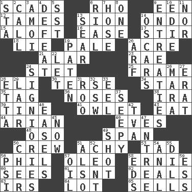 ACROSS 1. Loads 6. 17th letter of the Greek alphabet 9. Car or cant ending 12. Corrects by punishment or discipline 13. The Jewish people; Israel 14. Southwest Nigerian state 15. High up in or into the air 16. Relaxation 17. Disorderly outburst 18. Untruth 19. Diluted with white 20. Measure of real estate 21. Having or resembling wings 23. Actress Charlotte 24. Proofreading order 25. Movie unit 28. Connecticut Ivy Leaguer 30. Laconic 34. Play the lead 35. Label 36. Olfactory organs 38. Retirement account (abbr.) 39. Prong on a fork 41. A small or young owl 43. Ingest 44. Believer in; advocate of (suffix) 46. Nights before holidays 48. Bear (Spanish) 49. Connect, as a bridge 50. Ship's personnel 51. Painful 53. Small amount or degree 56. Silvers or Donahue 57. Margarine 58. Bert's buddy 60. Observes 61. Is not 62. Allots cards 63. Big collection agency 64. Car dealer's back yard 65. Makes a sale DOWN 1. R.R. building 2. Give a ring to 3. Mine, in Marseilles 4. Outscore 5. Fast jet (abbr.) 6. Monetary unit of Yemen 7. Flexible conduit 8. Single 9. Pleas 10. Singer Brickell 11. Or not 13. Burn superficially 14. Motion picture awards 19. Eucharist need 20. Sandy's bark 22. Allow 24. Seigniories (variant) 26. Hindu Mythology: god of death 27. Part of Q.E.F. 28. Singer James 29. Den 31. Friend of Pooh 32. Compass dir. 33. Snakelike fish 37. Oozy 40. Artist's stands 42. Federal power corp. 45. At this time 47. Main course 49. Attempt 50. "Mermaids" star 51. In addition 52. Penny 54. Of or related to the anus 55. Deli pickle 56. 23rd letter of the Greek alphabet 57. Lubricate 58. Begley and Asner 59. Curvy letter