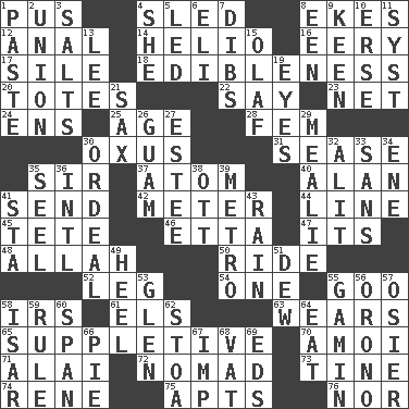 ACROSS 1. Tenth month of the Hindu calendar 4. Downhill vehicle 8. Supplements with great effort 12. Of or related to the anus 14. Sun: prefix 16. Suggestive of the supernatural 17. Drop; flow; fall 18. The property of being fit to eat 20. Lugs 22. Declare 23. Fish or hair follower 24. Followers of ems 25. Mature 28. Opposite of masc. 30. The longest river in Central Asia 31. Gospel singer Marvin 35. Title for a knight 37. Tiny particle 40. ____ Jay Lerner 41. Transmit 42. Distance measurement 44. Actor's bit 45. False hair 46. Singer James 47. It is 48. Assad's deity 50. Travel on or in a vehicle 52. Part of a journey 54. Single 55. Thick or sticky substance 58. Big collection agency 61. Raised railways 63. Erodes 65. Supplying deficiencies 70. Mine, in Marseilles 71. Mountain range southwest of Kyrgyzstan 72. Wanderer 73. Prong on a fork 74. French philosopher Descartes 75. Tenement units (abbr.) 76. And not DOWN 1. Thick mixture 2. The state of being joined or united 3. Table seasonings 4. A female animal or person 5. Directed 6. Biblical high priest 7. Rights 8. Car or cant ending 9. Peachy ____! 10. Celtic language 11. System (abbr.) 13. Area sheltered from the wind 15. Norwegian king 19. Snake ____ (dice throw) 21. Saxophone 26. Island territory of the United States 27. First name in cosmetics 29. Ear of corn 30. Severe or trying experience 32. Set down 33. Without 34. Compass dir. 35. Stitch closed the eyes of (a falcon) 36. International (abbr.) 38. Baseball player Mel 39. Paris' subway 41. R.R. building 43. Precipitation 49. Person who is morally reprehensible 51. Morning condensation 53. Small, secluded valley 55. Homeless child 56. U. of Maine site 57. Flexible twig of a willow tree 58. Austrian river, tributary to the Danube 59. General guideline 60. Connect, as a bridge 62. Portico 64. Consume 66. Sliced dessert 67. Mischievous child 68. Large container 69. Begley and Asner