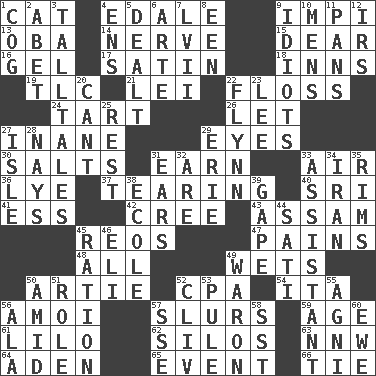 ACROSS 1. Domesticated feline 4. Peak District village in England 9. Body of Kaffir warriors 13. Chief or king in Benin or Nigeria 14. Boldness 15. Letter starter 16. Set 17. Smooth fabric 18. Restaurants 19. Affectionate concern, for short 21. Luau accessory 22. Soft thread for cleaning between teeth 24. Small pie 26. Allow 27. Silly 29. Snake ____ (dice throw) 30. Table seasonings 31. Merit 33. Atmosphere 36. Potassium hydroxide 37. Pulling apart 40. Indian title of respect (Mr.) 41. Curvy letter 42. Algonquian 43. Indian state 45. Vintage cars 47. Aches 48. 100% 49. Soaks 50. Nick name for Arthur 52. Tax preparer (abbr.) 54. Call ___ day 56. Mine, in Marseilles 57. Disparaging remarks 59. Grow older 61. _ and Stitch 62. Grain storage towers 63. Compass dir. 64. Arabian gulf 65. Incident 66. Standoff DOWN 1. Gear tooth 2. Collude with 3. Baron Munchausen's specialties 4. Followers of ems 5. Started a card game 6. Johnson of "Laugh-In" 7. 57 in ancient Rome 8. Car or cant ending 9. Foolish or stupid persons 10. Not women's 11. Zero-star reviews 12. Big collection agency 20. Patter 22. Film actor Errol 23. Area sheltered from the wind 25. Repose 27. Capri or Wight 28. Negative votes 29. 4th largest of the Great Lakes 31. Hearing organs 32. "We ___ not amused" (Victoria) 33. Helper 34. SW Asia republic 35. Basketball hoops 38. Learning spot: Fr. 39. Stare wonderingly 44. Suttee (variant) 45. Food allowance for one day 46. Biblical high priest 49. Make _____ (do battle with) 50. Among 51. Hero or heavy, e.g. 52. 154 in Roman numerals 53. Whimper 55. Hindu god of fire 56. Wing 57. Compass dir. 58. Fast jet (abbr.) 60. She-sheep