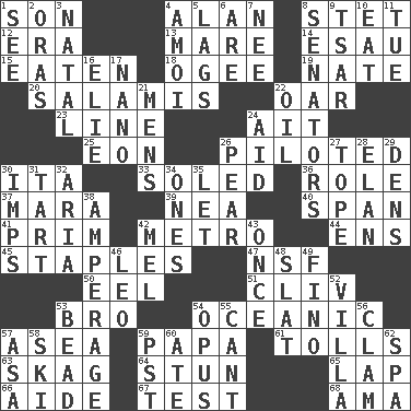 ACROSS 1. Boy, to dad 4. ____ Jay Lerner 8. Proofreading order 12. Period 13. Female horse 14. Son of Isaac 15. Ingested 18. Double curve, resembling the letter S 19. Nathan's nickname 20. Deli grouping 22. Boat paddle 23. Actor's bit 24. Small island 25. Period of immesurable duration 26. Manned the helm 30. Call ___ day 33. Having a sole or soles 36. Hero or heavy, e.g. 37. Hindu Mythology: god of death 39. Teachers' org. 40. Connect, as a bridge 41. Demure 42. Paris' subway 44. Followers of ems 45. Paper fasteners 47. Overdraft (abbr.) 50. Snakelike fish 51. 154 in Roman numerals 53. Sis' sibling 54. Pertaining to the sea 57. At sea 59. Dad 61. For Whom the Bell _____ 63. Heroin 64. Make senseless or dizzy 65. Pet locale 66. Assistant 67. Trial 68. Nanny (var.) DOWN 1. Perceive with the eye 2. Mouths or openings 3. Relating to or accompanying birth 4. Mine, in Marseilles 5. Straggles 6. "We ___ not amused" (Victoria) 7. Born 8. Legislators 9. Russian ruler of old 10. Ingest 11. Third day of the wk. 16. Writer Wiesel 17. Billionth: prefix 21. Not women's 22. Petroleum 24. Help 26. Lightbulb-shaped fruit 27. Drink excessively 28. Liveliness 29. Habitations of wild animals 30. Naughty children 31. Small pie 32. Roberta Peters solo 34. Washington bills 35. Allow 38. Electrical Measurement 42. Cartoonist voice _ Blanc 43. Single time 46. Lion 48. Narrow board 49. Fine (Spanish) 52. Country estate 53. Necklace unit 54. Musical composition 55. Patter 56. Burrowing marine mollusk 57. White ___ sheet 58. What Jean-Claude Killy likes to do 59. Pacific Standard Time (abbr.) 60. Had dinner 62. Health resort