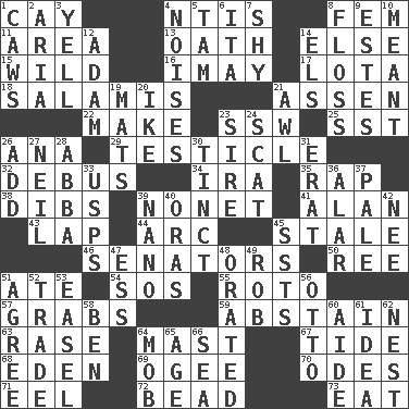 ACROSS 1. Island 4. Nuclear Threat Initiatives 8. Opposite of masc. 11. Type of rug 13. Pledge 14. Otherwise 15. Uncontrolled 16. "If ____ say so..." 17. Globular water bottle used in Asia 18. Deli grouping 21. NE Netherlands city 22. Cause to be 23. Compass dir. 25. Fast jet (abbr.) 26. Santa ___, CA 29. A testis 32. Alight from a bus 34. Lyricist Gershwin 35. Strike 38. Rights 39. Music written for nine 41. Actor Alda or Thicke 43. Pet locale 44. Curve 45. Showing deterioration from age 46. Legislators 50. To sift 51. Had dinner 54. Distress signal 55. Printing process, for short 57. Seizes 59. Refrain by choice 63. To erase 64. Vertical spar for supporting sails 67. Event that recurs at intervals 68. Genesis locale 69. Double curve, resembling the letter S 70. Lyric poems 71. Snakelike fish 72. Necklace unit 73. Consume DOWN 1. Crow sounds 2. Roberta Peters solo 3. Shout 4. Annoying sounds 5. Scottish cap 6. Call ___ day 7. Like a shrinking violet 8. Soft thread for cleaning between teeth 9. _____ Park, CO 10. Intended 12. First man 14. Raised railways 19. Floor protectors 20. Eisenhower's nickname 21. Leather borer 23. Title for a man of rank and authority 24. Get outta here! 26. Find the sum of 27. Famous astronaut Armstrong 28. Swedish rock group 30. Colored lightly or faintly 31. Part of Q.E.F. 33. United States Postal Service (abbr.) 36. Having or resembling wings 37. Light colored 39. Billionth: prefix 40. Mouths or openings 42. Born 45. Fast planes 47. Double-curved letter 48. Spoke pompously 49. Director Reiner 51. Match 52. Buy and sell 53. Artist's stand 56. Von Bismarck 58. Benjamin's nick name 60. Helper 61. The content of cognition 62. Egg locale 64. Crowd into 65. Ripen 66. Ocean