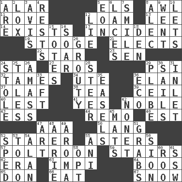 ACROSS 1. Having or resembling wings 5. Raised railways 8. Leather borer 11. Be footloose 12. Rich soil 13. Area sheltered from the wind 14. Is extant 17. Event 19. Moe Howard, for one 21. Chooses 22. Play the lead 23. Elected rep. 24. R.R. building 27. Greek god of love 29. Air pressure measure (abbr.) 32. Corrects by punishment or discipline 34. Shoshoni 36. Flair 37. Norwegian king 38. Afternoon social gathering 39. To provide with a ceiling 40. For fear that 41. It is so 42. Having high moral qualities 43. Double-curved letter 44. San ____ (Riviera town) 46. Eastern Standard Time (abbr.) 47. Auto club (abbr.) 50. Austrian-born American filmmaker Fritz 52. A viewer who gazes fixedly 55. Michaelmas daisies 57. Characterized by complete cowardliness 59. Flight of steps 62. Period 63. Body of Kaffir warriors 64. Scornful sounds 65. Spanish title 66. Ingest 67. Frozen precipitation DOWN 1. "We ___ not amused" (Victoria) 2. Brine-cured salmon 3. Advice 4. Musical pauses 5. Period of immesurable duration 6. Shoestrings 7. Grin 8. Actor Baldwin 9. Left 10. Allows 12. Whopper 15. Lugs 16. Fly high 18. Lair 20. Sulky 24. Took without asking 25. Falsehoods 26. Collect or gather 28. Bull 29. Cadet 30. Travel by water 31. An arm off of a larger body of water 33. Bank Draft (abbr.) 35. Artist's stands 36. Environmental prefix 42. Music written for nine 45. Floor protectors 47. Nonscientific branch of learning 48. Nest on high 49. Scent 51. Seizes 52. Moved rapidly 53. "Corrida" creature 54. Actor Alda or Thicke 55. Cuckoo 56. The Jewish people; Israel 58. Elect 60. Friend of Pooh 61. Compass dir.