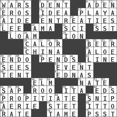 ACROSS 1. Armed conflicts 5. Incision 9. An important port of Yemen 13. Greek god of love 14. The content of cognition 15. Beach, in Buenos Aires 16. Assistant 17. Pleas 19. Area sheltered from the wind 20. Nursemaid (var.) 21. _-fi 22. Fast jet (abbr.) 23. Rich soil 25. Electrically charged atom 26. Bodily heat indicating an inflammation 30. Fermented drink made from hops 34. Large country 35. _ vera 36. Inside; within (prefix) 39. Depends 42. Actor's bit 43. Perceives with the eye 44. Incident 46. Portable shelter 47. Ferber et al. 48. Shade tree 51. Nathan's nickname 54. Plant excrement 57. Friend of Pooh 58. Call ___ day 60. Begley and Asner 62. Conciliate 65. Sever or remove by pinching or nipping 66. Nest on high 67. Proofreading order 68. "Tell ____ the Marines!" 69. Assign a rank or rating to 70. Not wild 71. Inconspicuous attention getter DOWN 1. Welt 2. Satellite of Uranus 3. Cowboy competition 4. Compass dir. 5. South Vietnam president (1954) 6. Pulitzer Prize-winning author Ferber 7. Fish or hair follower 8. Tarsus (plural) 9. Keyboard modifier key 10. Raised platform 11. Sight organs 12. Political cartoonist Thomas 15. Ache 18. Environmental prefix 20. Nursemaid 24. Buttonhole 27. Mouth edge 28. Single 29. Indian princess (variant) 30. Greek mezzo-soprano Agnes 31. Biblical high priest 32. Period of immesurable duration 33. To riddle 36. Eastern Standard Time (abbr.) 37. Born 38. Lair 40. Movie disc 41. Elected rep. 45. Nanny 48. One of the Great Lakes 49. Car dealer's back yard 50. Damp 52. Portable shelters 53. Proofreads 54. Practice fight 55. Type of rug 56. Sweet dark-red dessert wine 58. A distinct part 59. False hair 61. Blemish 63. Sliced dessert 64. "One Day ___ Time" 65. Small drink