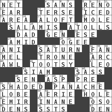 ACROSS 1. Fish or hair follower 4. Without 8. Former U.S. Attorney General Janet 12. Ewer handle 13. Laconic 14. On the rocks 15. Length times width 17. At or to great height 18. Undercover agent 19. Deli grouping 21. Ringlike coral islands and reefs 23. Male parent 24. Commissioned military rank (abbr.) 26. Compass dir. 27. Among 28. Double curve, resembling the letter S 30. Cuckoo 31. Titan orbits this 34. Air blower 37. Cartoonist voice _ Blanc 38. Heavy duty weighing machine 39. Curve 40. Leather borer 41. A girl or young woman (variant) 42. Lion 43. Thailand, formerly 44. Backtalk 46. Elected rep. 47. Viper 50. Before (prefix) 51. Cast a shadow over 54. Flamboyance 57. Ear part 58. Nest on high 60. Opening into or through something 62. Independent ruler or chieftain 63. Lacking in sense or substance 64. Bear (Spanish) 65. Habitations of wild animals 66. Fast planes 67. Lair DOWN 1. Teachers' org. 2. Hearing organs 3. Excercise machine 4. Former Milwaukee Brewers owner Bud 5. Came up 6. Science/research agcy. 7. Stalk of a moss capsule 8. Full of chinks, cracks, or crevices 9. Learning spot: Fr. 10. 1994 drama film starring Jodie Foster 11. Lyric poems 13. Scottish cap 16. Mountain range southwest of Kyrgyzstan 20. Find the sum of 22. Adolescent 25. Parts of speech 27. Afresh 29. Jennifer or Joel 30. Housemaid (var.) 31. Portico 32. Scent 33. Small child 34. It jiggles the polygraph 35. Ancient Greek god of war 36. Non-commissioned officer (abbr.) 41. Prong on a fork 43. Spring feasts 44. Health resort 45. Bowlike part 46. Unit of acoustic absorption 48. Small fatty European fish 49. Aches 51. Downhill vehicle 52. Residence 53. Raised platform 55. Born 56. Otherwise 59. Followers of ems 61. Age