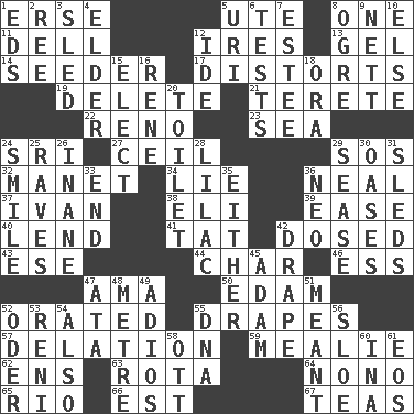 ACROSS 1. Celtic language 5. Shoshoni 8. Single 11. Small valley 12. Angers 13. Set 14. Sowing specialist 17. What propaganda does 19. Keyboard key 21. Cigar-shaped 22. Western Nevada city 23. Ocean 24. _ Lanka 27. To provide with a ceiling 29. Mayday 32. French painter Edouard 34. Falsehood 36. Actress Patricia 37. "Terrible" tsar 38. Biblical high priest 39. Comfort 40. Grant temporary use of 41. Make lace 42. Administered medicine 43. Compass dir. 44. Burn to charcoal 46. Curvy letter 47. Nursemaid (var.) 50. Dutch treat 52. Declaimed 55. Window treatments 57. Conveyance 59. Ear of corn 62. Followers of ems 63. Roll call or roster of names 64. Words to Nanette 65. _ de Janeiro 66. Eastern Standard Time (abbr.) 67. Beverages made from leaves DOWN 1. Begley and Asner 2. To separate or throw off 3. Downhill vehicle 4. A person who is older than you are 5. RI univ. 6. Trials 7. First name in cosmetics 8. Legendary monster 9. Remaining after all deductions 10. Otherwise 12. Binary compound 15. Voters do this 16. French philosopher Descartes 18. Mouth or opening 20. Bathroom plumbing fixture 24. Grin 25. All-night dance parties 26. Empty; void 28. Pale purple color 29. Gospel singer Marvin 30. Fertile tracts in a desert 31. Bobsleighs 33. Conclude 35. One or the other 36. Modern: prefix 42. Window treatment 45. First of billions? 47. _ moment's notice (2 wds.) 48. Distance measurement (Brit.) 49. Goodbye (Sp.) 51. Intended 52. River in Europe 53. Painter Guido (1575-1642) 54. In addition 55. Heredity factor (abbr.) 56. _ gin 58. Baseball player Mel 60. _ tizzy (2 wds.) 61. Greek goddess of the dawn