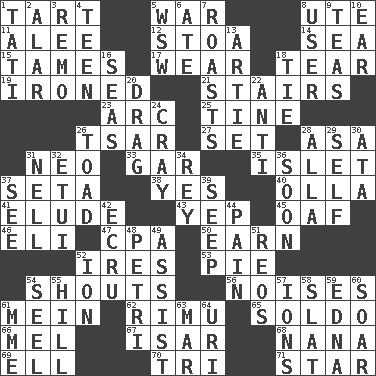 ACROSS 1. Small pie 5. Armed conflict 8. Shoshoni 11. Toward shelter 12. Portico 14. Ocean 15. Softens 17. Erode 18. Pull into pieces 19. Pressed 21. Flight of steps 23. Curve 25. Prong on a fork 26. Russian ruler of old 27. Arrange properly for use 28. White ___ sheet 31. Modern: prefix 33. Slender fish 35. Small island 37. Stalk of a moss capsule 38. Consenting reply 40. Rounded earthenware pot or jar 41. Dodge 43. Slangy assent 45. Clumsy lout 46. Biblical high priest 47. Tax preparer (abbr.) 50. Merit 52. Angers 53. Sliced dessert 54. Yells 56. Annoying sounds 61. Count _ (2 wds.) 62. Tall New Zealand timber tree 65. Twentieth part of a lira 66. Cartoonist voice _ Blanc 67. Austrian river, tributary to the Danube 68. Nanny 69. Pipe bend 70. Three (prefix) 71. Play the lead DOWN 1. Jacques of French films 2. Having or resembling wings 3. San ____ (Riviera town) 4. Adolescent 5. Compass dir. 6. Had dinner 7. Ridicules or criticizes harshly 8. One who uses or employs something 9. Beverages made from leaves 10. Ewer handle 13. Nick name for Arthur 16. Oceans 18. Make a knot 20. To be drawn or hauled along 22. Opposed to 24. Supercomputer manufacturer 26. Frog relative 28. Silent film actress Nazimova 29. Automatically 30. _ moment's notice (2 wds.) 31. 1994 drama film starring Jodie Foster 32. Needle case 34. Marina Del _, California 36. Within a short period 37. Perceive with the eye 39. Ooze 42. Shade of tan 44. Ache 48. _ dish (used to culture cells) 49. Aid 51. Vintage cars 52. Electrically charged atom 54. Sew up the eyelids of hawks and falcons 55. Land elevation 57. Charged particles 58. Narrow board 59. Pulitzer Prize-winning author Ferber 60. Fly high 61. Madame (abbr.) 63. Make imperfect 64. RI univ.