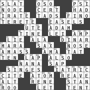ACROSS 1. Narrow board 5. Bear (Spanish) 8. 23rd letter of the Greek alphabet 11. Connecting point 12. Certainty 14. Possessed 15. Feeling or showing extreme anger 17. Small boys 18. A pale, very dry sherry 19. Cigar-shaped 21. Artist's stands 23. Shoshoni 25. First man 26. Prong on a fork 27. Luau accessory 28. Electrical Unit 31. Untruth 33. Chicken ___ king 35. Middle Eastern gold or silver currency 37. Hindu Mythology: god of death 38. Saxophone 40. Olfactory organ 41. Collect or gather 43. Nanny (var.) 45. Make lace 46. Nine, plus one 47. Pet locale 50. In addition 52. Nanny 53. Plant excrement 54. Burns superficially 56. Of or pertaining to medicine 61. Quote 62. Smallest unit of an element 65. Break or tear apart 66. Keyboard modifier key 67. French philosopher Descartes 68. Comedian Laurel of Laurel & Hardy 69. Friend of Pooh 70. Allow 71. Portable shelter DOWN 1. In a ____ (agitated or irritated) 2. Old wives' tales, e.g. 3. The sixth month of the Jewish calendar 4. Wig 5. Sep. follower 6. Ocean 7. Severe or trying experience 8. Silvers or Donahue 9. Without 10. Wedding promise 13. Sadhe (variant) 16. Needle case 18. Opposite of masc. 20. Inactive volcano in Sicily 22. Expressed in words 24. Snakelike fish 26. Beverages made from leaves 28. Small Philippine buffalo 29. Vertical spar for supporting sails 30. Before (prefix) 31. Unable to walk 32. SW Asia republic 34. American Automobile Association (abbr.) 36. To the inside or interior of 37. Floor covering 39. Dec. holiday 42. Volcanic refuse 44. Mountain range southwest of Kyrgyzstan 48. Approach 49. Soft color 51. Practice fight 52. Compass dir. 54. Grain storage tower 55. "Tell ____ the Marines!" 57. Trial 58. Assign a rank or rating to 59. "Terrible" tsar 60. Penny 61. Auto 63. Single 64. Was introduced to