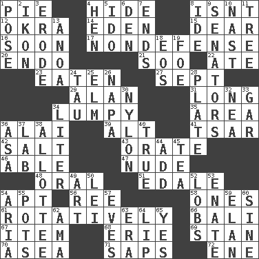 ACROSS 1. Sliced dessert 4. Flintstone garb 8. Is not 12. Gumbo ingredient 14. Paradise 15. Letter starter 16. Within a short period 17. Unrelated to defense, as in spending 20. Inside; within (prefix) 21. "Barney Miller" actor Jack 22. Had dinner 23. Eroded 27. Back-to-school mo. 29. Actor Alda or Thicke 31. Having great length 34. Containing lumps 35. Type of rug 36. Jai ____ 39. The first octave above the treble staff 41. Russian ruler of old 42. Table seasoning 43. Speak pompously 46. Competent 47. Unadorned 48. Taken by mouth 51. Peak District village in England 54. Fitting 56. To sift 58. Singles 61. Producing rotation 66. Indonesian resort city 67. A distinct part 68. 4th largest of the Great Lakes 69. Comedian Laurel of Laurel & Hardy 70. At sea 71. Plant excrements 72. Compass dir. DOWN 1. Airs 2. Picture 3. Eat (away) 4. Layer 5. Wedding promise 6. Lair 7. Conclusions 8. Binary compound 9. Elected representatives 10. Political cartoonist Thomas 11. Family _ (genealogy) 13. Small Philippine buffalo 18. Greek goddess of the dawn 19. Enemy 24. The 19th letter of the Greek alphabet 25. Shade tree 26. California wine valley 28. Food holder 30. High-strength synthetic material 32. Teachers' org. 33. Slender fish 34. 61 cubic inches 36. White ___ sheet 37. Experiment locale 38. One to whom something is allotted 40. Loyal 44. Say or write further 45. Beverage made from leaves 49. Tate display 50. Flowery wreath 52. Tennis shots 53. Related on the mother's side 54. Operatic vocal solo 55. Plant holders 57. Nights before holidays 59. Enthusiasm 60. Trig term 62. Nursemaid (var.) 63. Period 64. Mouth edge 65. It is so
