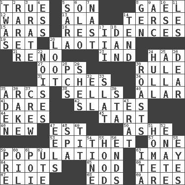 ACROSS 1. Loyal 5. Manchild 8. Highlander 12. Armed conflicts 13. Wing 14. Laconic 15. Caspian sea tributary 16. Homes 19. Arrange properly for use 20. Of or relating to Laos or its people 21. Western Nevada city 23. Working for oneself (abbr.) 24. Possessed 27. I made a mistake 30. General guideline 31. Skin irritations 34. Rounded earthenware pot or jar 35. Arches 38. Makes a sale 40. Having or resembling wings 41. Have the gumption 42. Chalkboards 44. Supplements with great effort 45. Small pie 46. ___ Haven, CT 47. Eastern Standard Time (abbr.) 50. American tennis player Robert 53. Curse 57. Single 59. Census information 63. "If ____ say so..." 64. Disturbances 65. Dreamland 66. Wig 67. Writer Wiesel 68. Begley and Asner 69. Ancient Greek god of war DOWN 1. It was, poetically 2. More valued for its uncommonness 3. A salt of uric acid 4. Double-curved letter 5. "Two Mules for Sister ____" 6. Butter sub 7. Political cartoonist Thomas 8. Commissioned military rank (abbr.) 9. Curve 10. Compass dir. 11. French article 14. Be inclined (to) 17. One more than two 18. Daniel's nick name 20. Plunder 22. Annoying sounds 24. Frame or body of a ship 25. Silent film actress Nazimova 26. Letter starter 28. Personal Computers (abbr.) 29. "______ My Girl" (Turtles hit) 30. Ridicules or criticizes harshly 32. Pipe bend 33. Narrow board 35. Arabian gulf 36. Immoral or dissolute person 37. Group working together 39. R.R. building 43. Part of Q.E.F. 47. Snakelike fish 48. Health resort 49. Teat (slang) 51. Simpsons dad 52. Related on the mother's side 54. Prong on a fork 55. Parka part 56. Extremities 58. Sight organs 59. Before (prefix) 60. Lubricate 61. Luau course 62. Shoshoni 63. Call ___ day