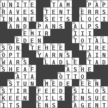 ACROSS 1. Join together 6. Scottish cap 9. Infant food 12. All-night dance parties 13. Portable shelter 14. Blunders 15. Silly 16. Puts into a specified state 17. Locales 18. Added to 19. Baking dishes 20. High mountains 21. Independent ruler or chieftain 23. One more than two 24. Paradise 25. "_____ Recall" 28. Boy, to dad 30. Giggle 34. Hoop that covers a wheel 35. Elect 36. Entertaining tales 38. The 18th letter of the Arabic alphabet 39. Armed conflicts 41. Dipping utensil 43. Small amount or degree 44. Archer's quiver 46. American tennis player Robert 48. "One Day ___ Time" 49. "Beetle Bailey" pooch 50. Make senseless or dizzy 51. Ancient Persian 53. Car or cant ending 56. Agitate 57. Nourish 58. Grain storage towers 60. Peachy ____! 61. Petroleums 62. Take place subsequently 63. It is 64. Followers of ems 65. Representative DOWN 1. RI univ. 2. Grandmother 3. "Terrible" tsar 4. Watched over 5. Compass dir. 6. Adolescent 7. Pismires 8. Mountains (abbr.) 9. Conciliate 10. Curves 11. Air pressure measure (abbr.) 13. Russian ruler of old 14. American author Paul (1891-1958) 19. Abounding in pines 20. Small island 22. Was introduced to 24. Pleas 26. Operatic vocal solo 27. Grant temporary use of 28. Sty mamas 29. Brightly colored fish 31. Actor Linden 32. Period 33. Conclusion 37. Schedule 40. Titan orbits this 42. Eastern Standard Time (abbr.) 45. Avid follower 47. Weeding 49. Probability 50. Proofreading order 51. Count _ (2 wds.) 52. Snakelike fish 54. Otherwise 55. Part of speech 56. What Jean-Claude Killy likes to do 57. Enemy 58. Ocean 59. Arrange properly for use